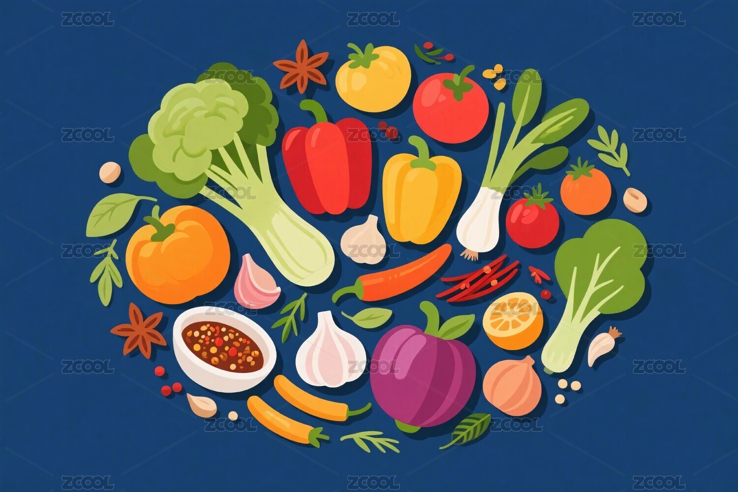 厨房工具,食材,木勺,木铲,叉子,调料瓶,辣椒,鸡蛋,绿叶,调味酱