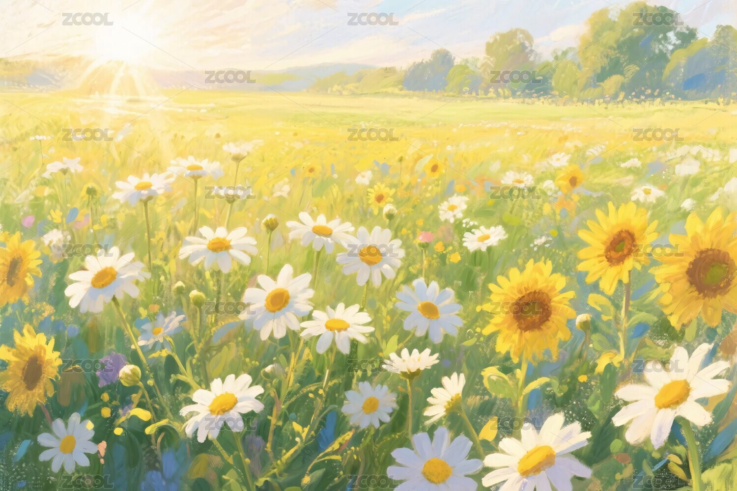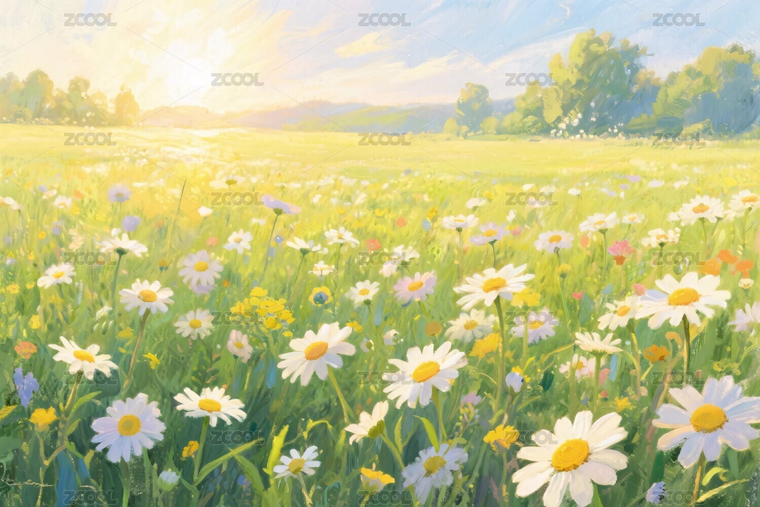 田野,花草,花海,风景,插画,自然,田园,山水,远山,花卉