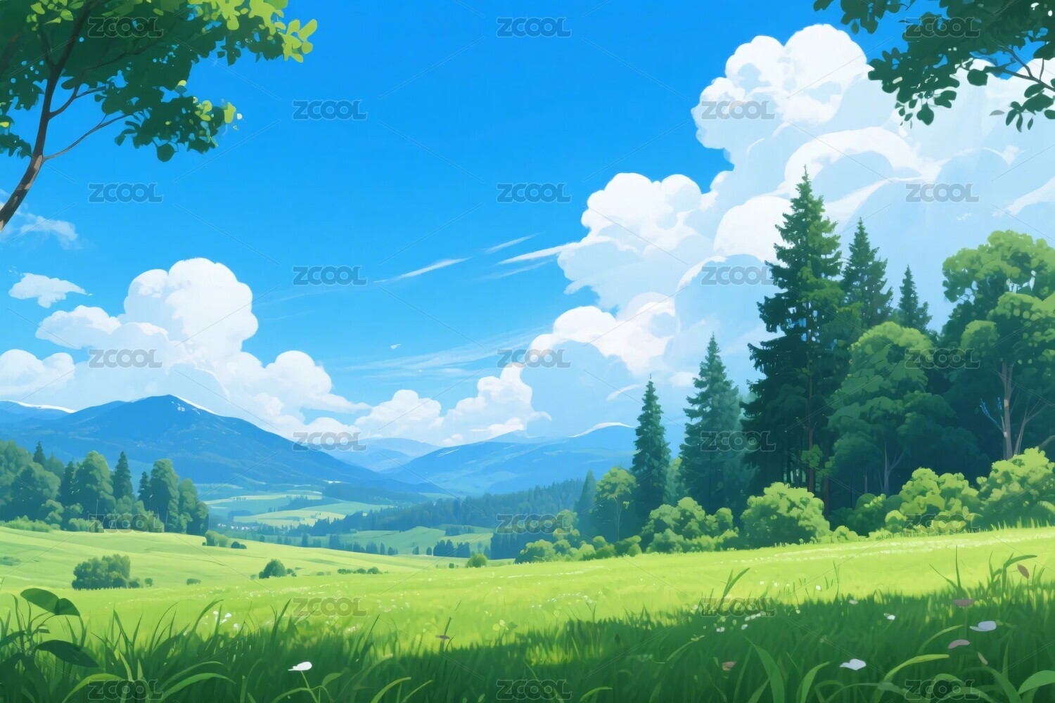 蓝天,白云,太阳,草地,树木,远山,丘陵,自然,田园,风景