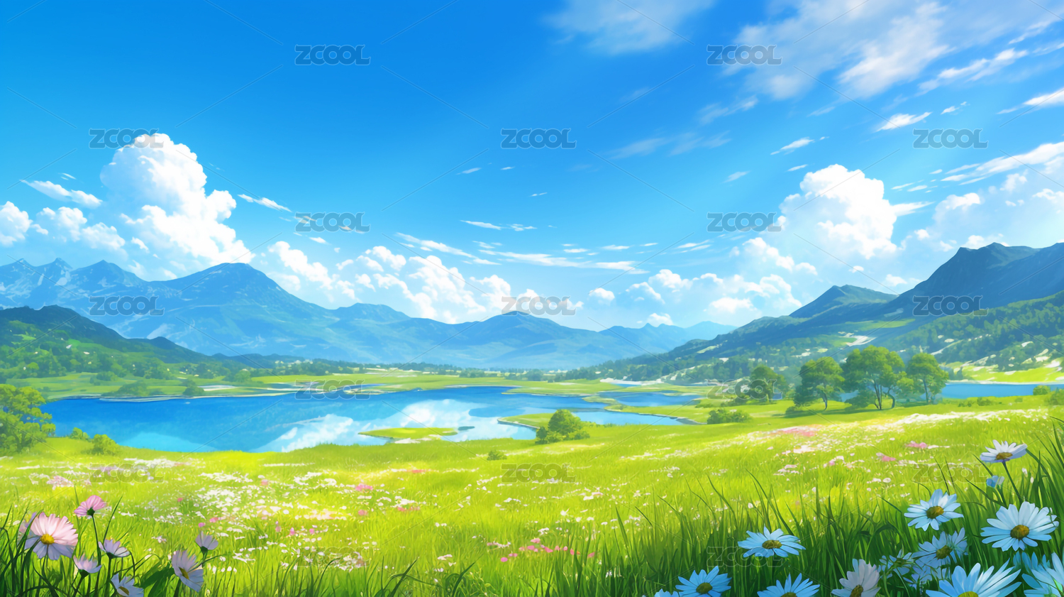 山水,湖泊,草地,山脉,天空,雾气,花草,风景,美景,自然
