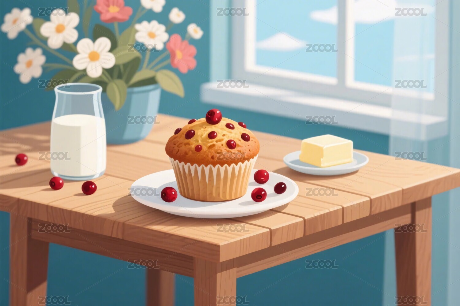 杯子蛋糕,牛奶,黄油,木桌,插画,窗景,花朵,甜点,早餐,室内