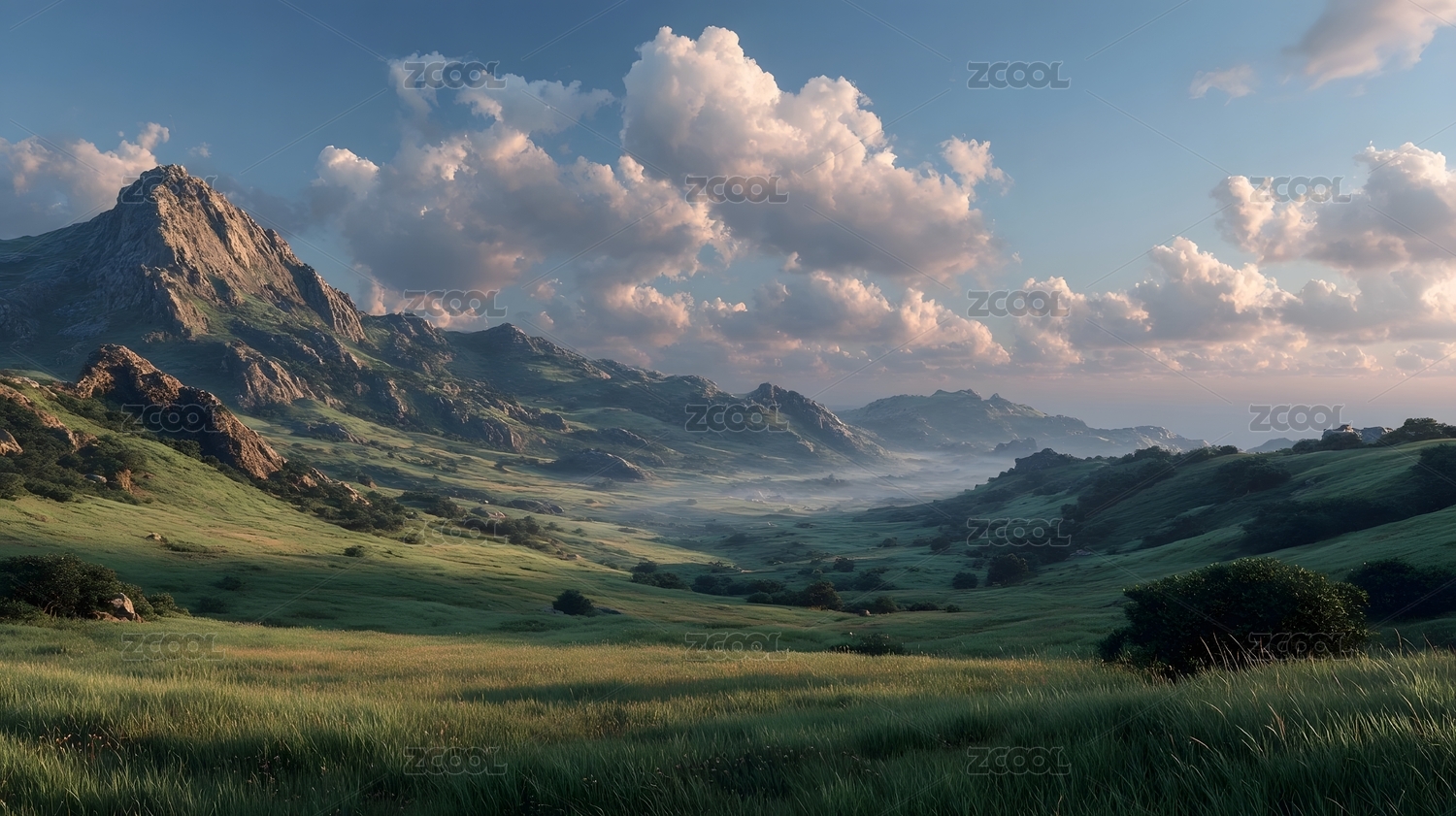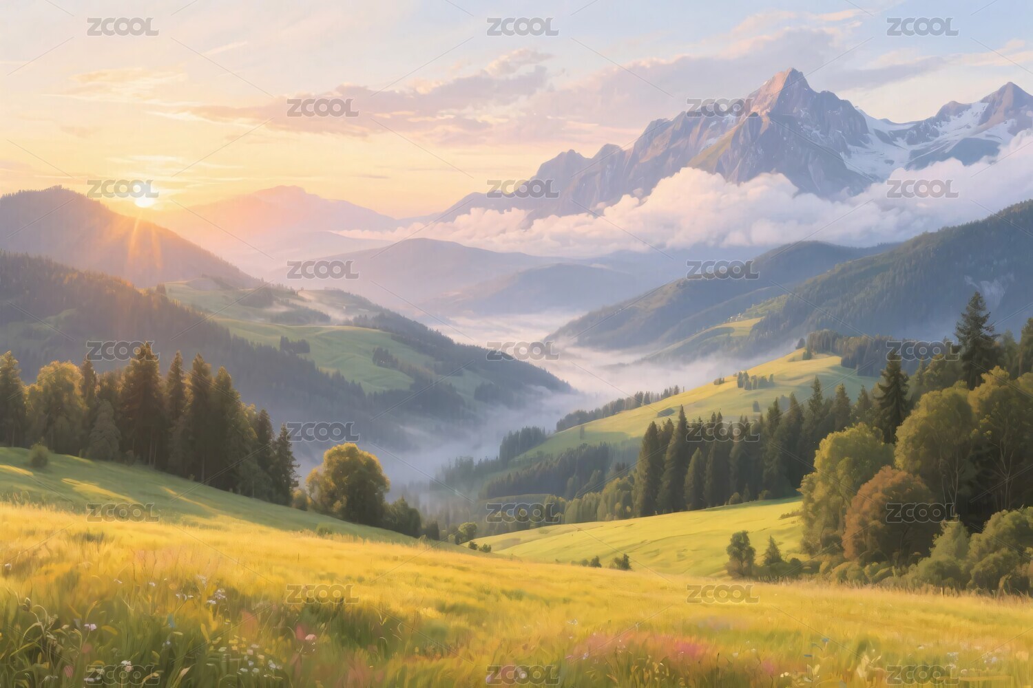 山水,风景,绿地,树林,山脉,河流,云雾,自然,风景画,插画