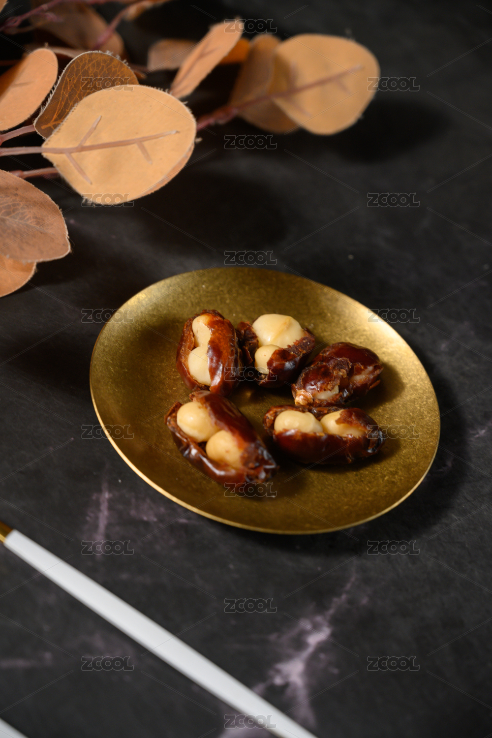 桌面上的盘子里的美味可口的椰枣夏威夷果仁