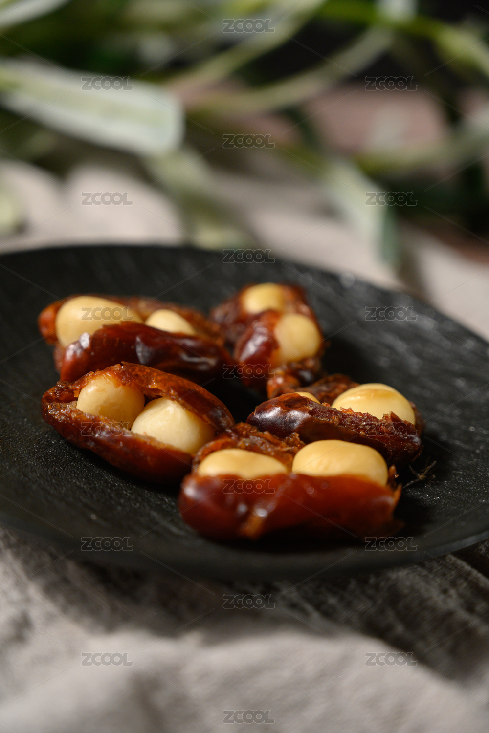 桌面上的盘子里的美味可口的椰枣夏威夷果仁