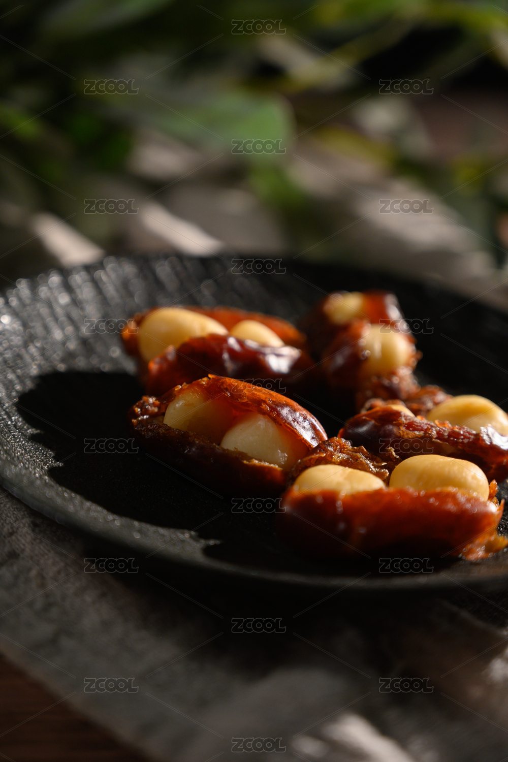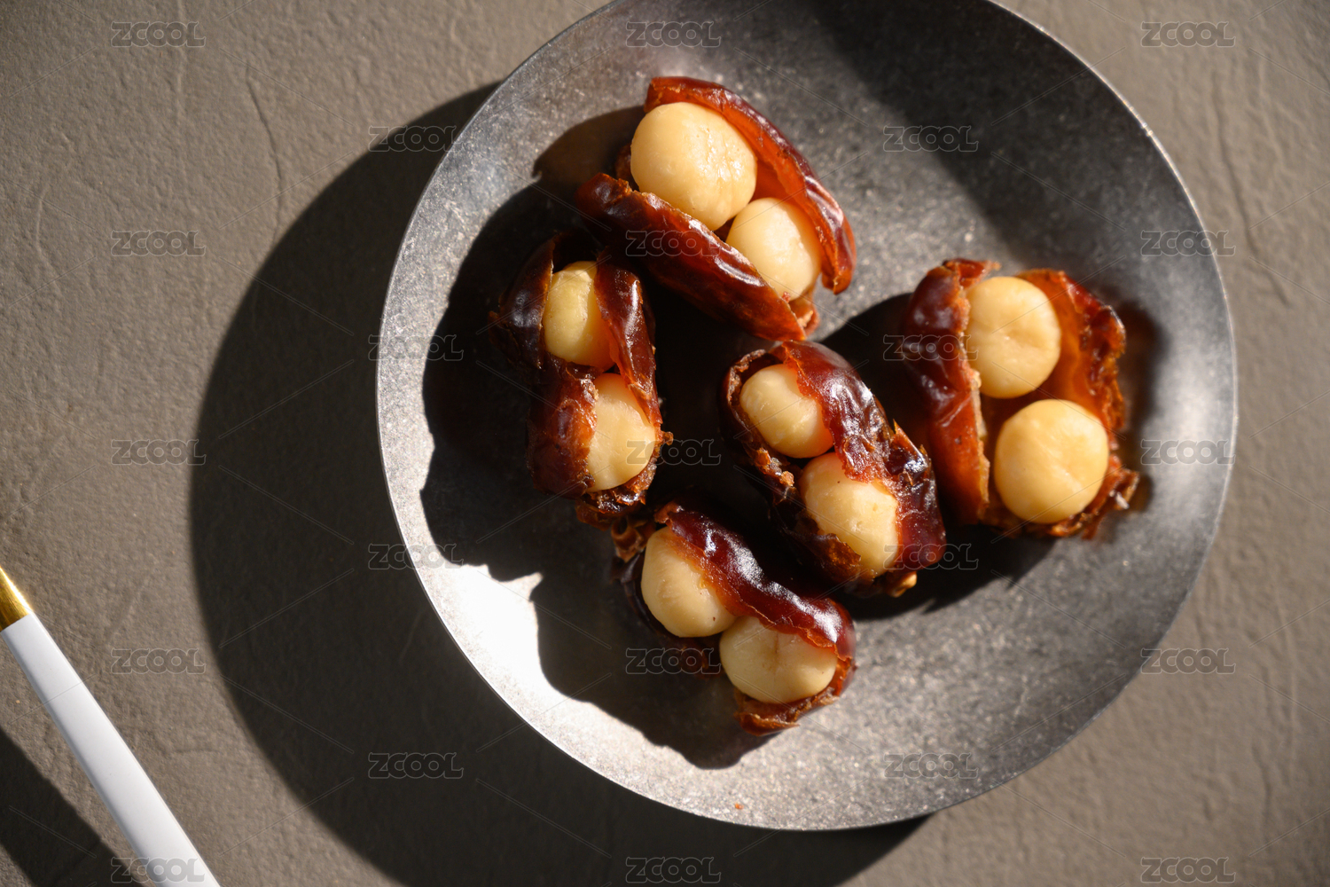 桌面上的盘子里的美味可口的椰枣夏威夷果仁