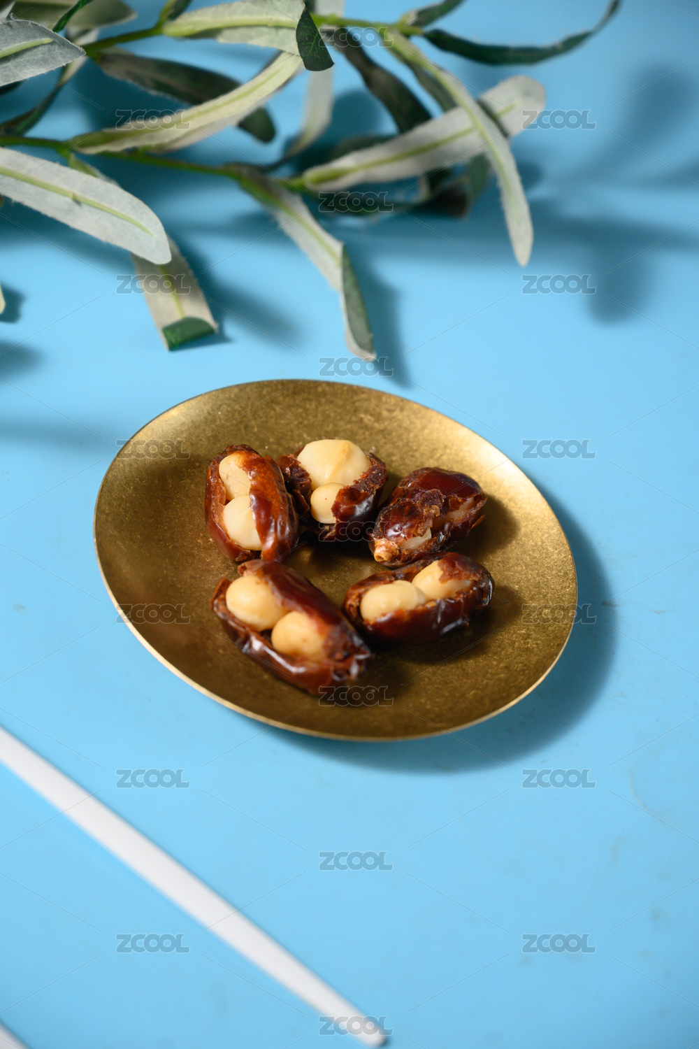 桌面上的盘子里的美味可口的椰枣夏威夷果仁