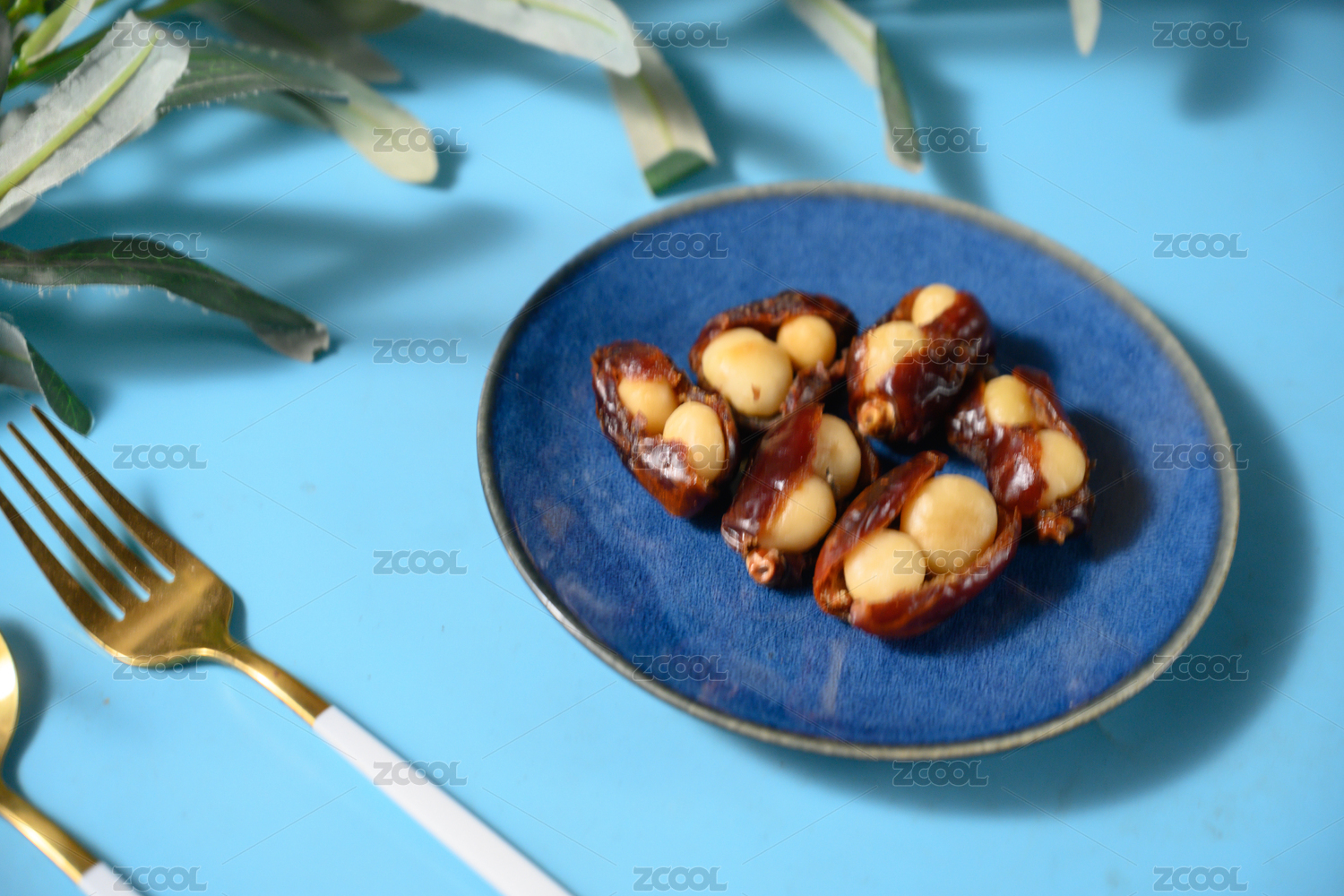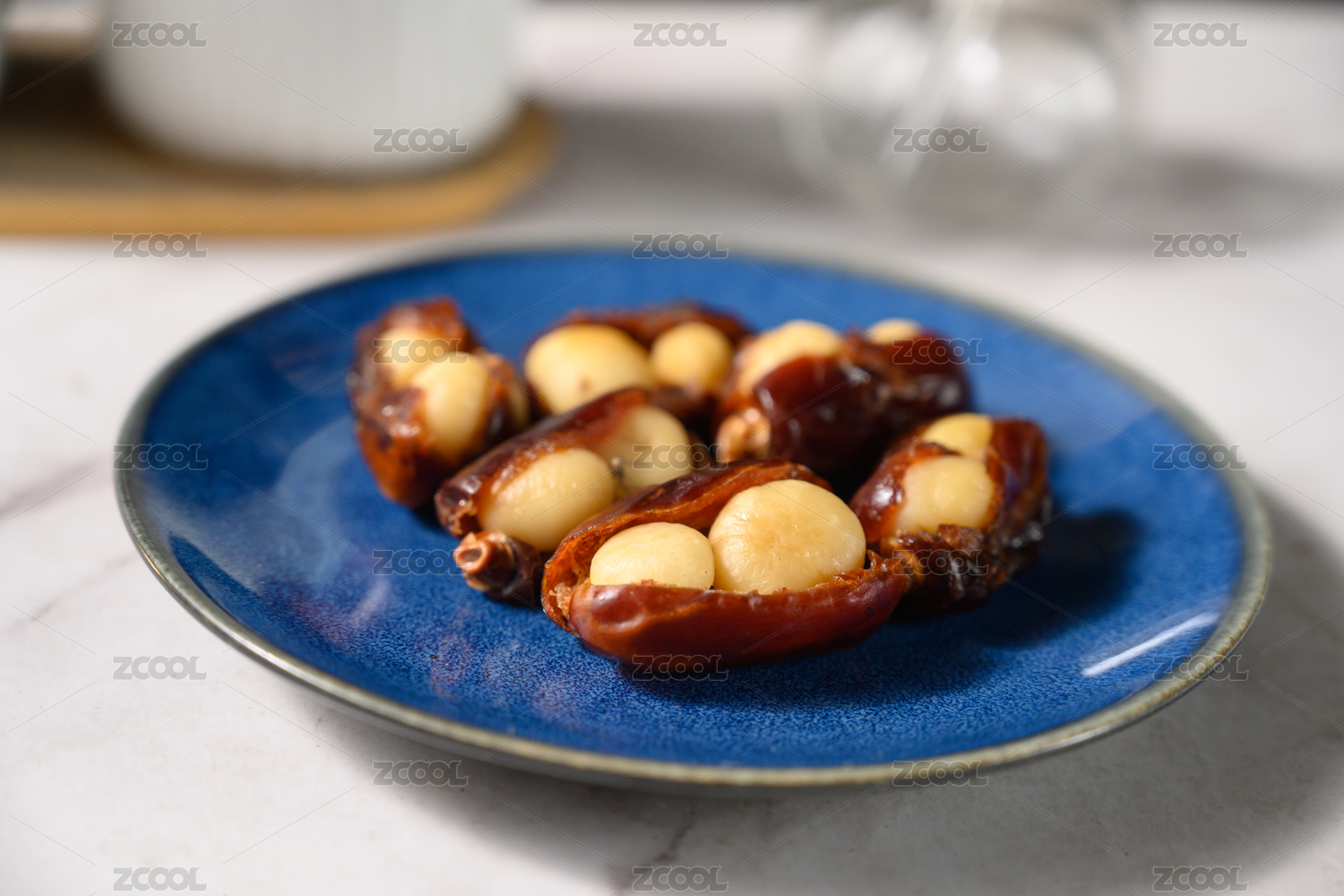 桌面上的盘子里的美味可口的椰枣夏威夷果仁