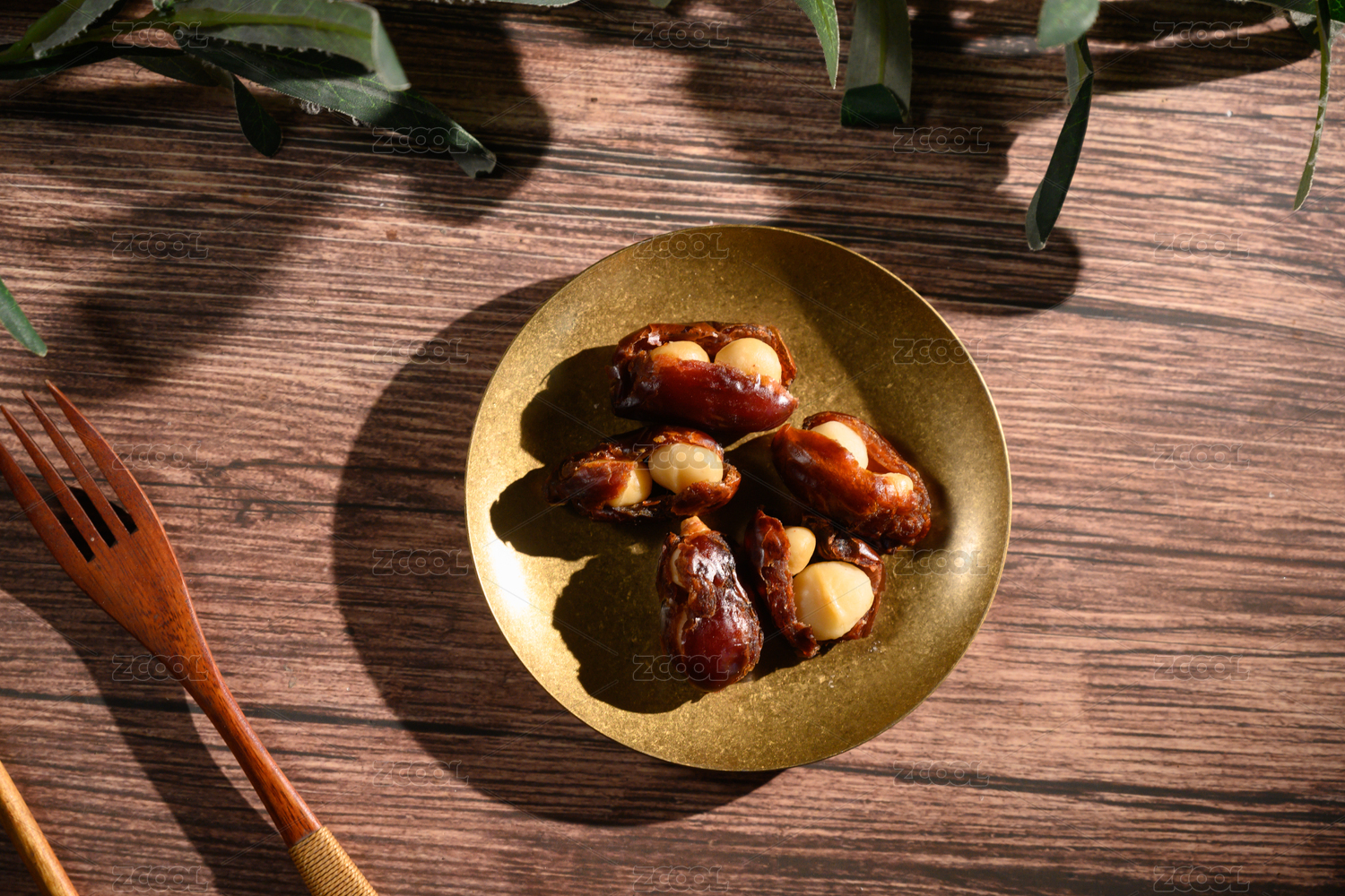 桌面上的盘子里的美味可口的椰枣夏威夷果仁