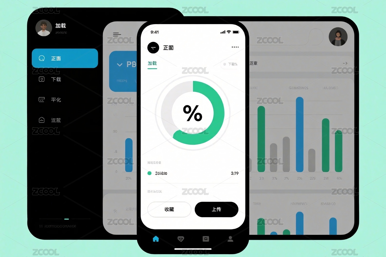 数据图表,环形图,柱状图,百分比,应用界面,统计界面,信息可视化,界面菜单,导航栏,按钮