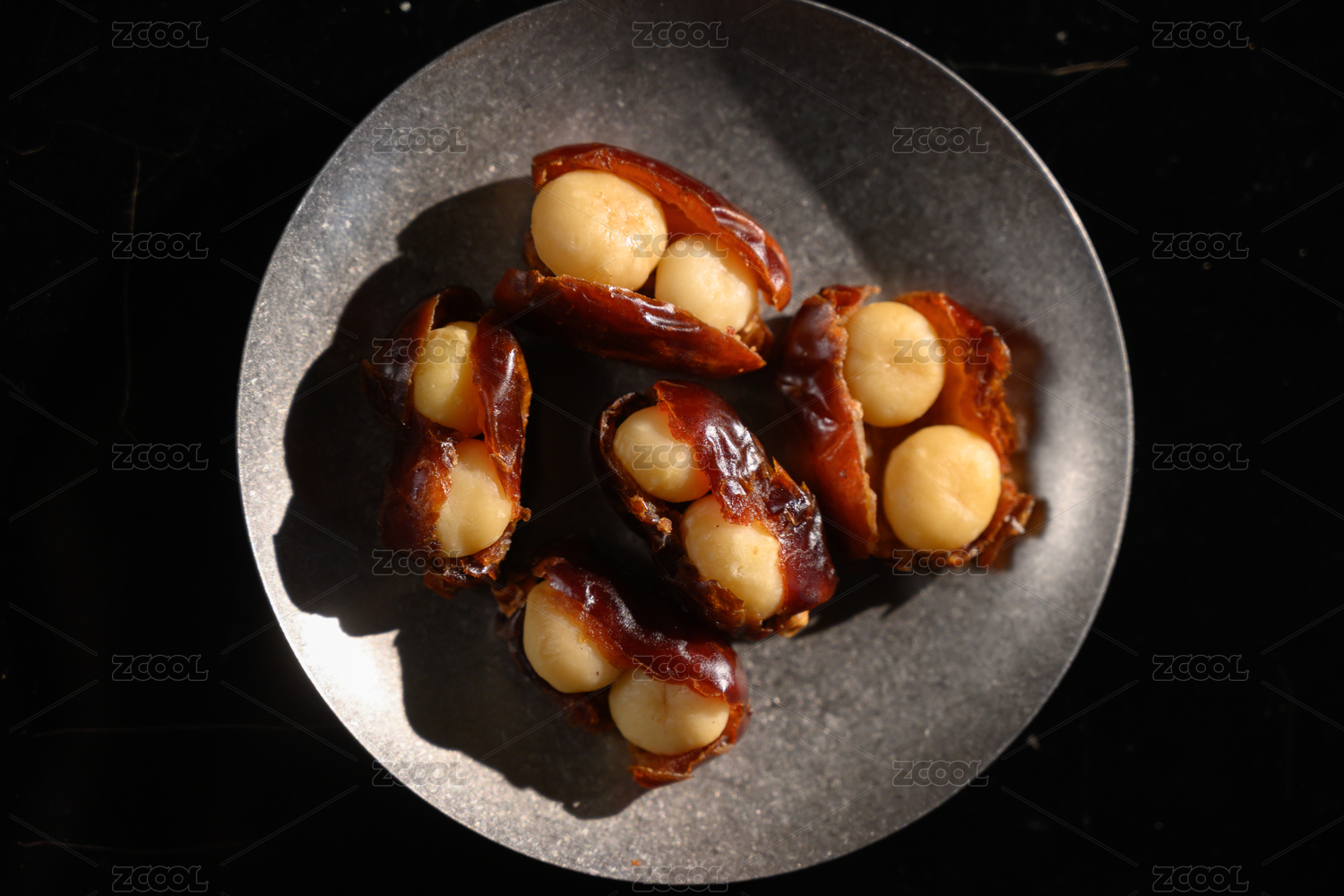 桌面上的盘子里的美味可口的椰枣夏威夷果仁