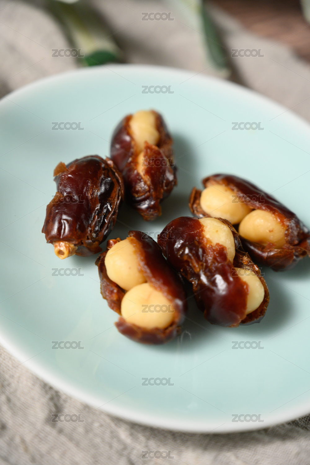 桌面上的盘子里的美味可口的椰枣夏威夷果仁