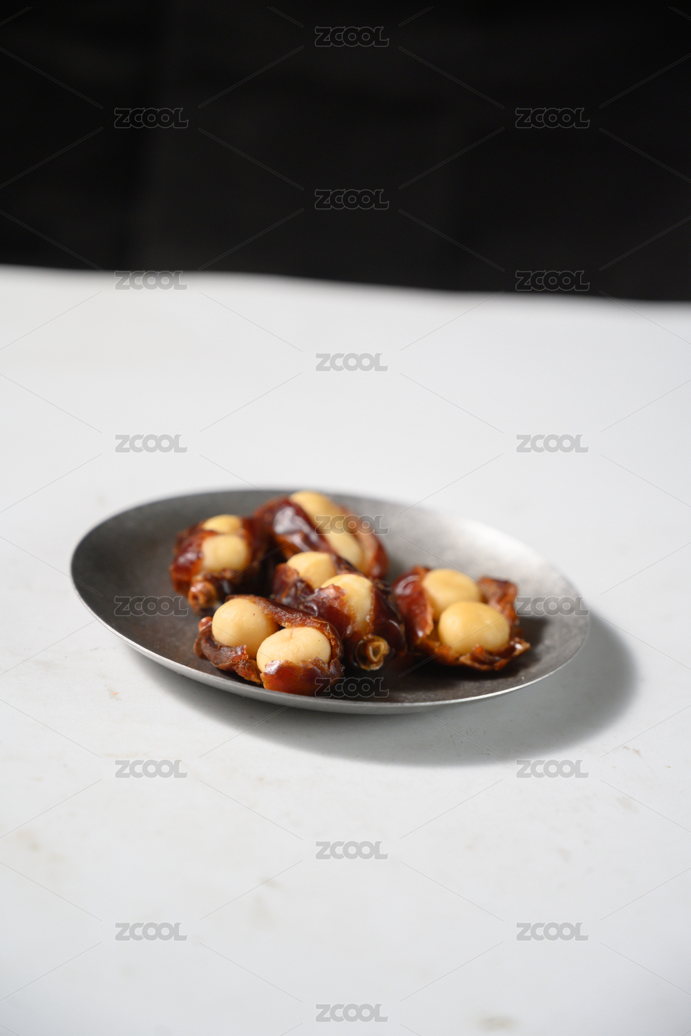 桌面上的盘子里的美味可口的椰枣夏威夷果仁
