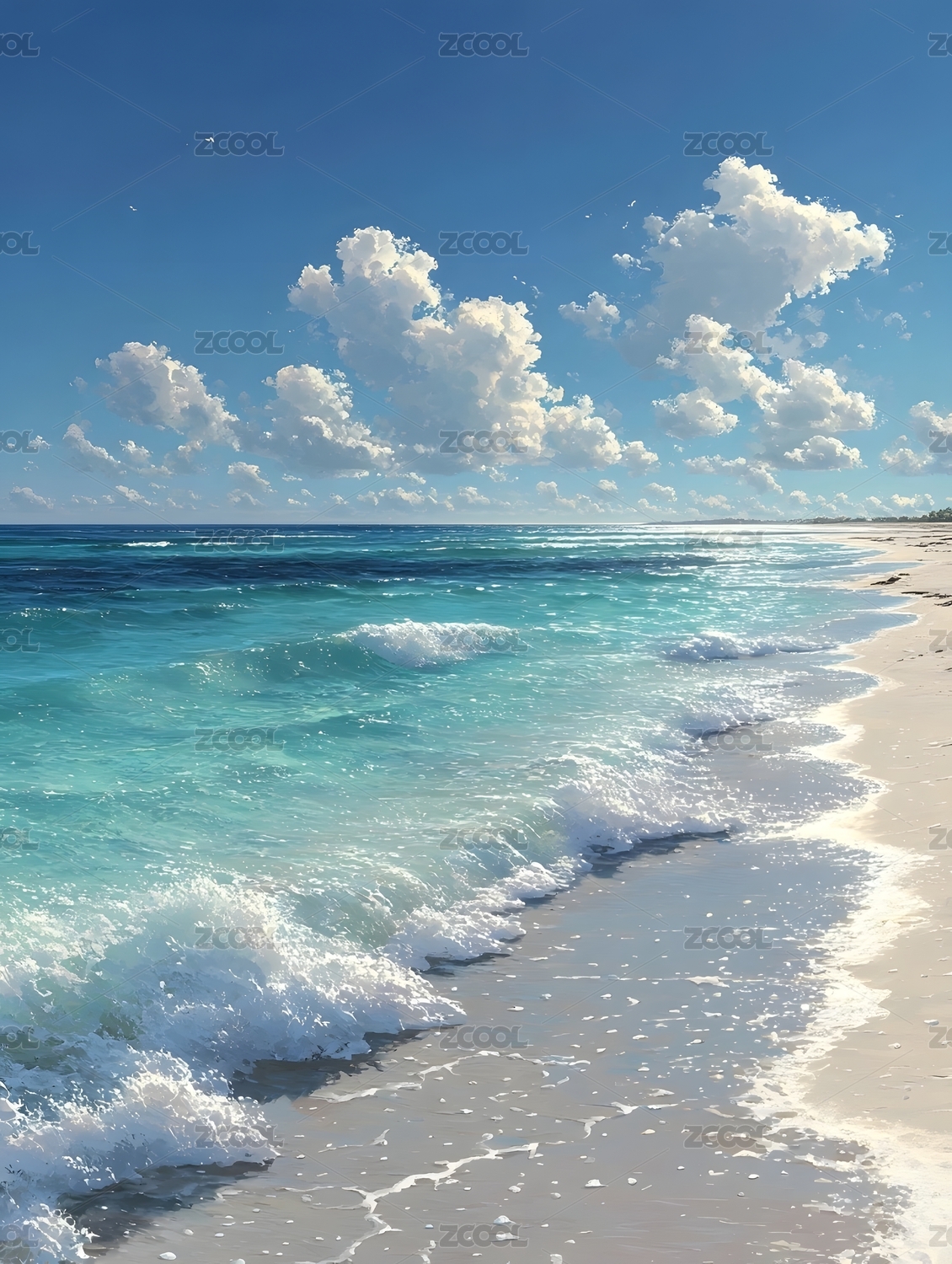 海滩,海水,浪花,沙滩,白云,蓝天,自然景观,风景,插画,海洋