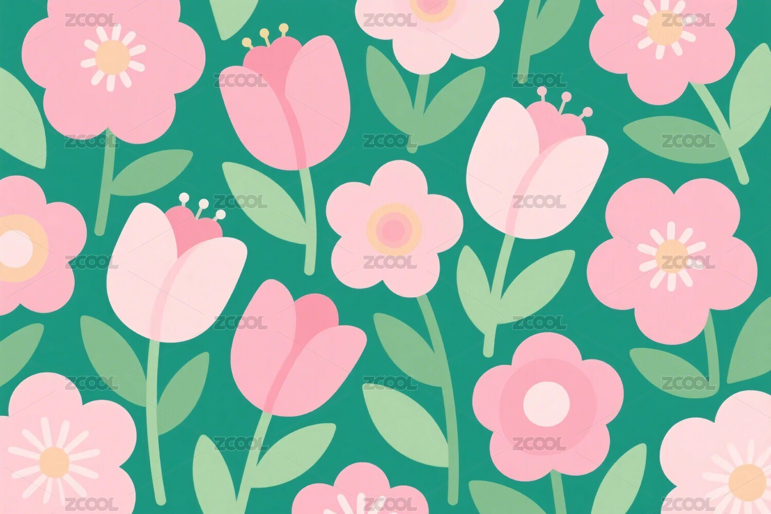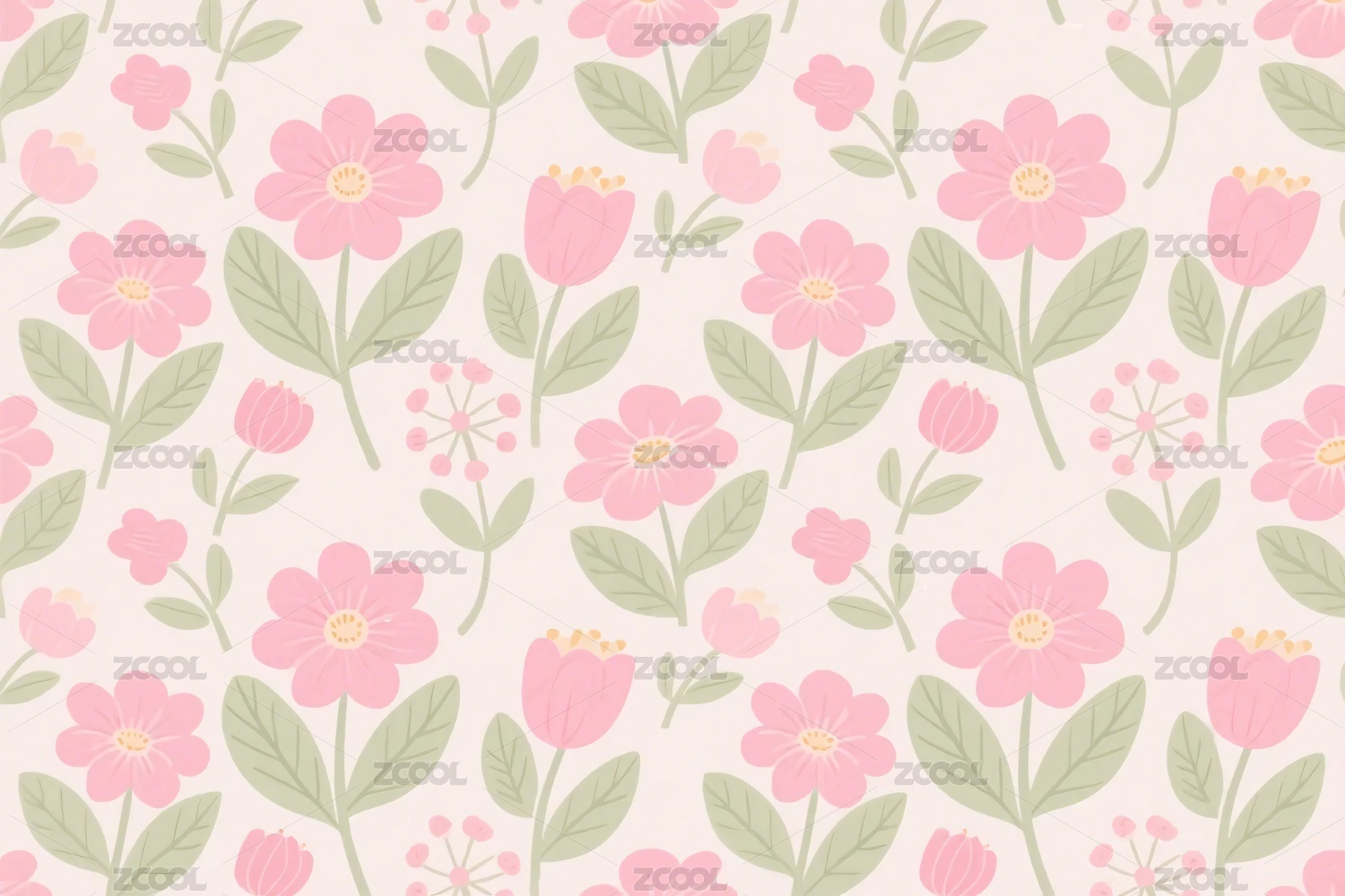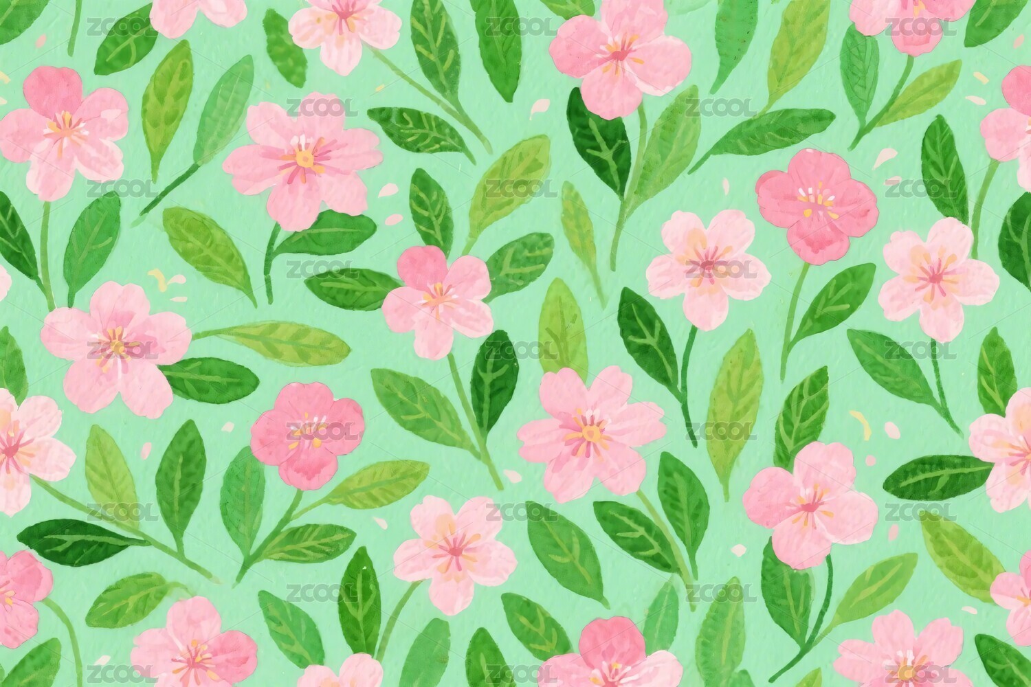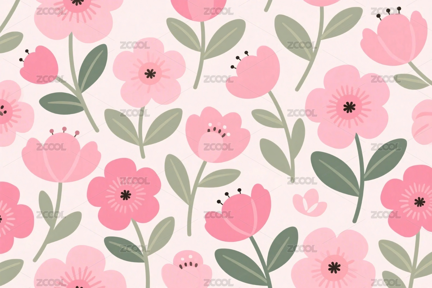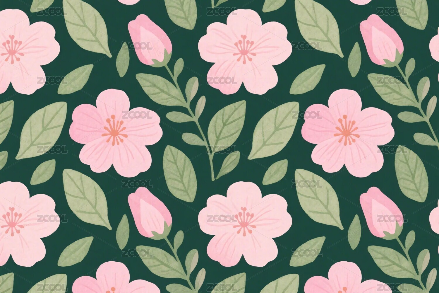 粉色花朵,绿色叶子,花卉,插画,图案,植物,背景,扁平设计,矢量图,装饰