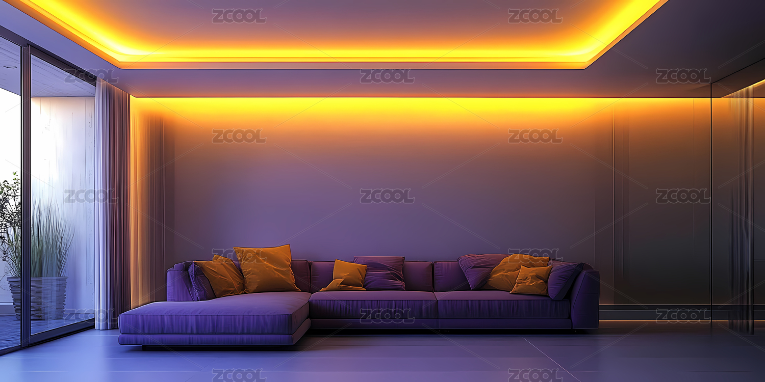 现代客厅紫色沙发与黄色灯带