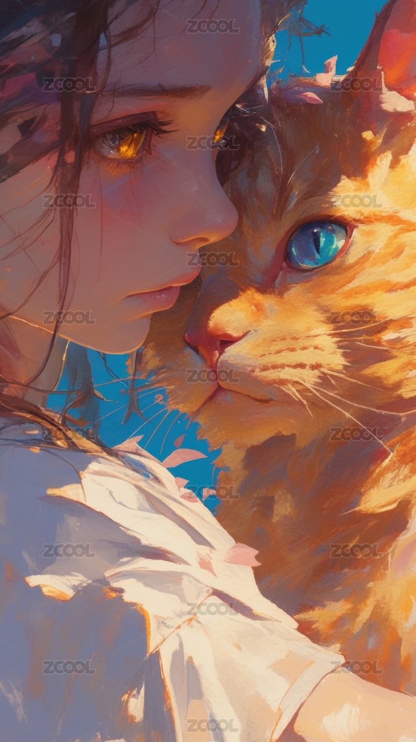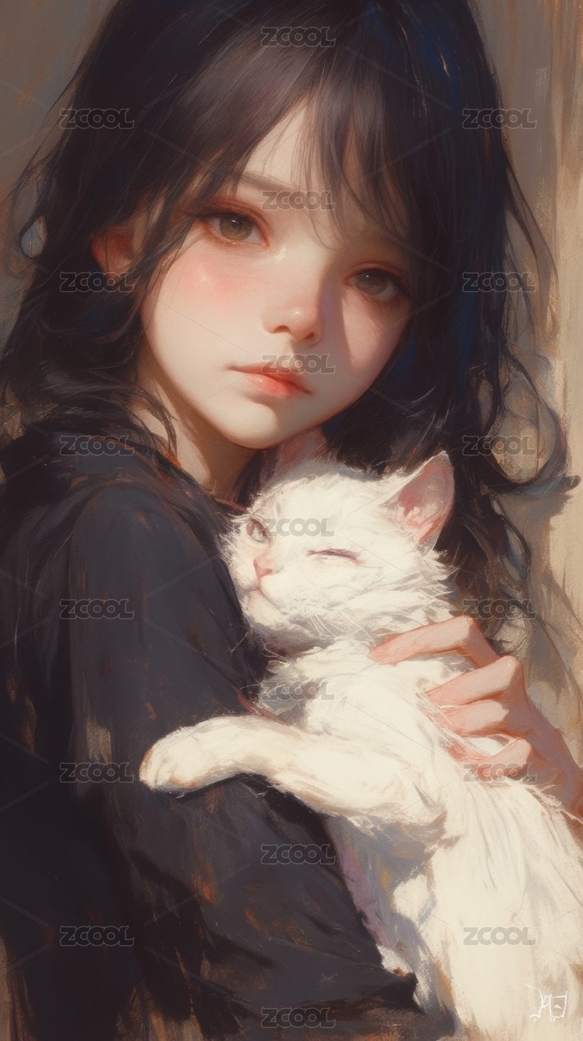 怀抱白猫的温柔少女