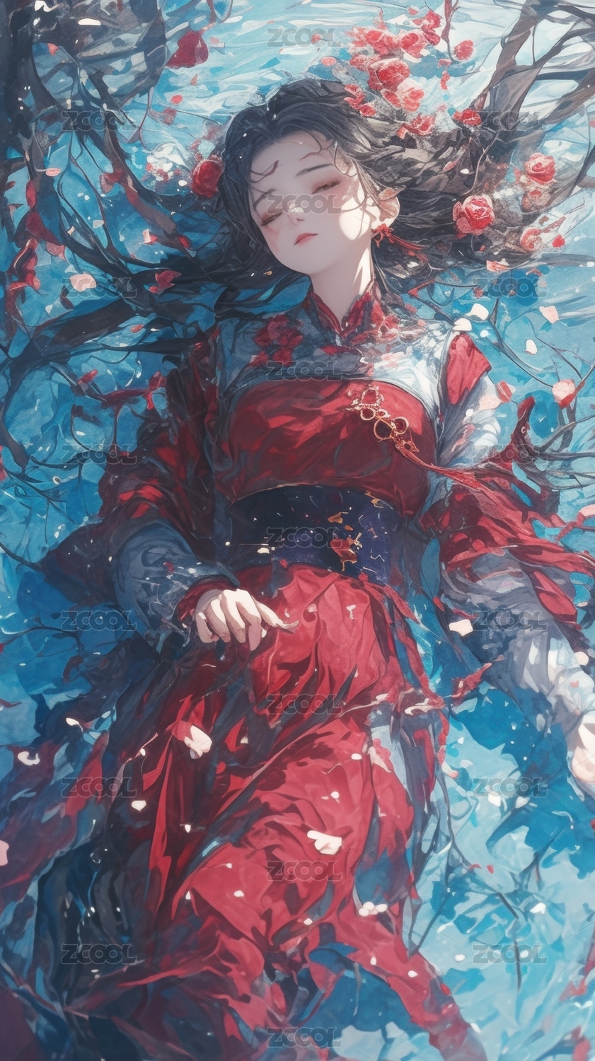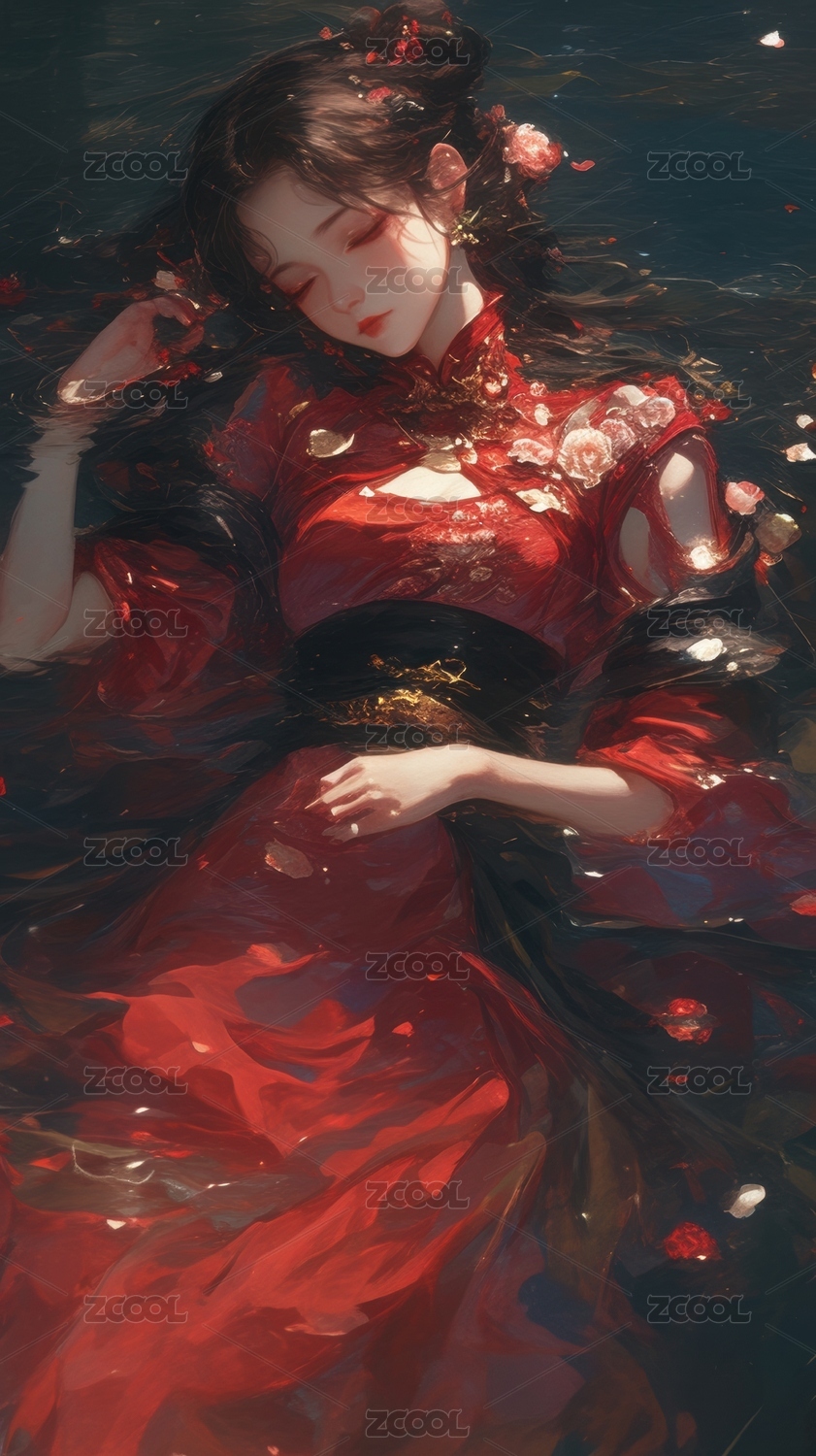 红衣女子水中漂浮花瓣环绕