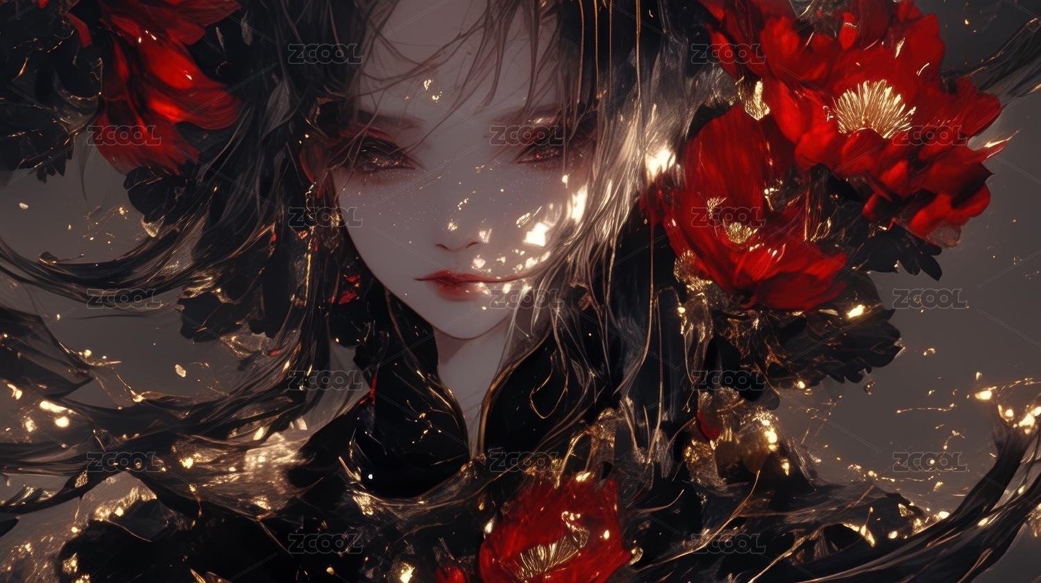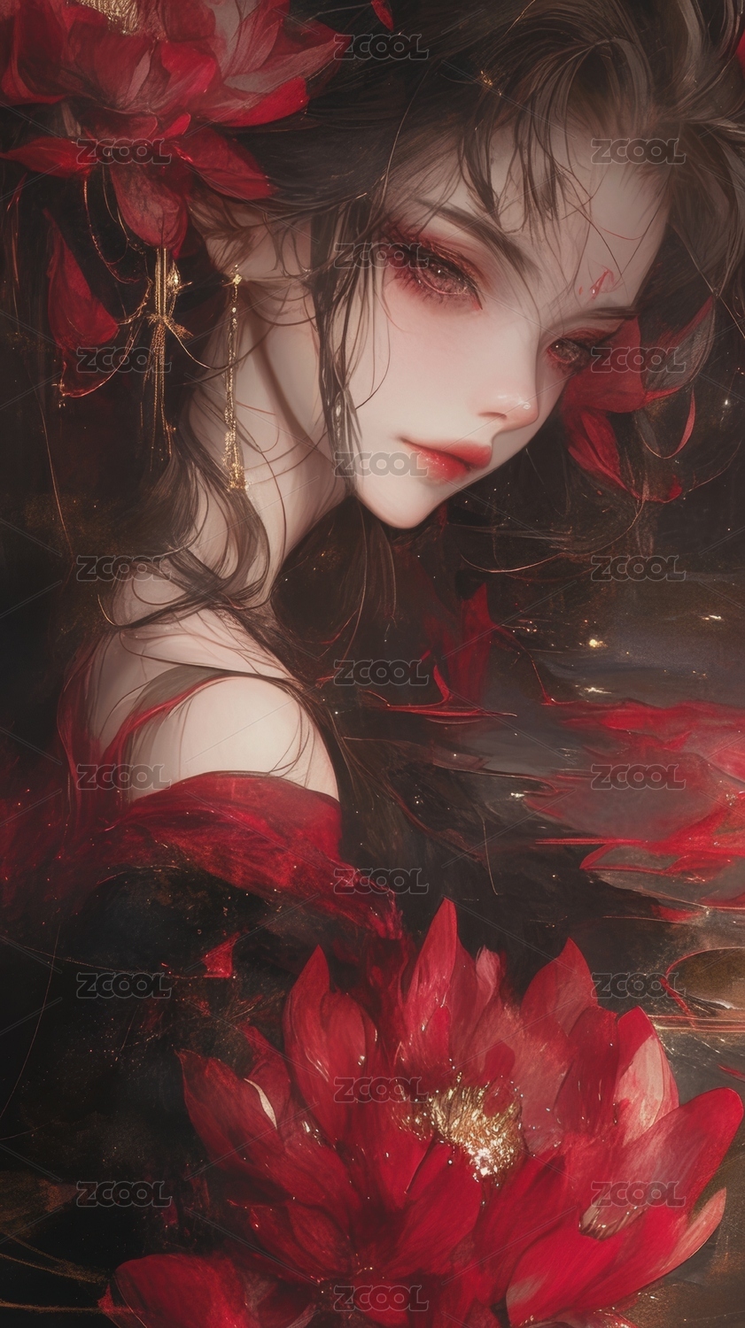 梦幻女子与红色花朵的融合艺术