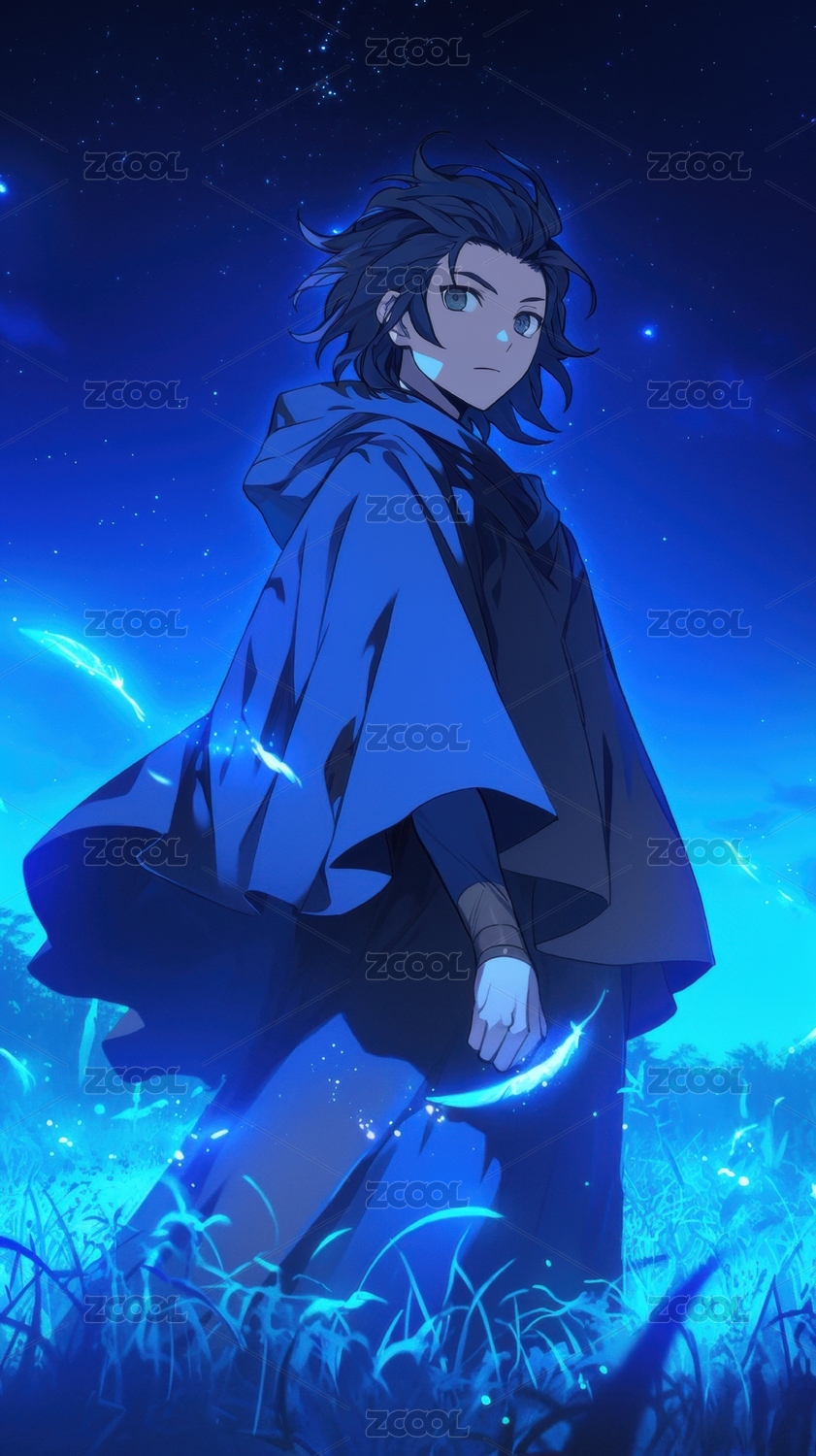 蓝色眼睛,冷色调,动漫角色,破碎玻璃,神秘光芒,未来科技,光影效果,科幻元素,细节丰富,艺术风格