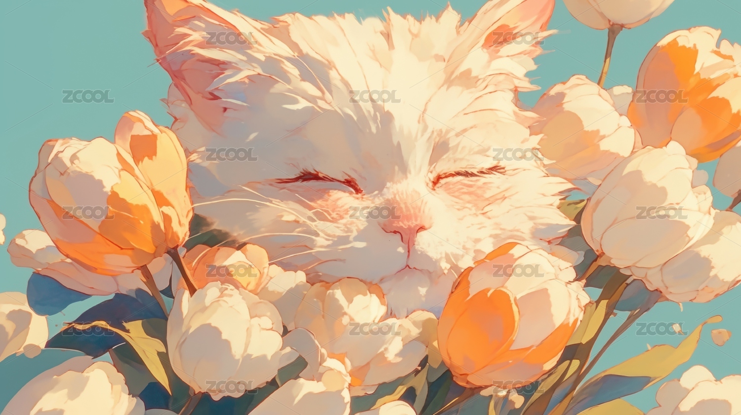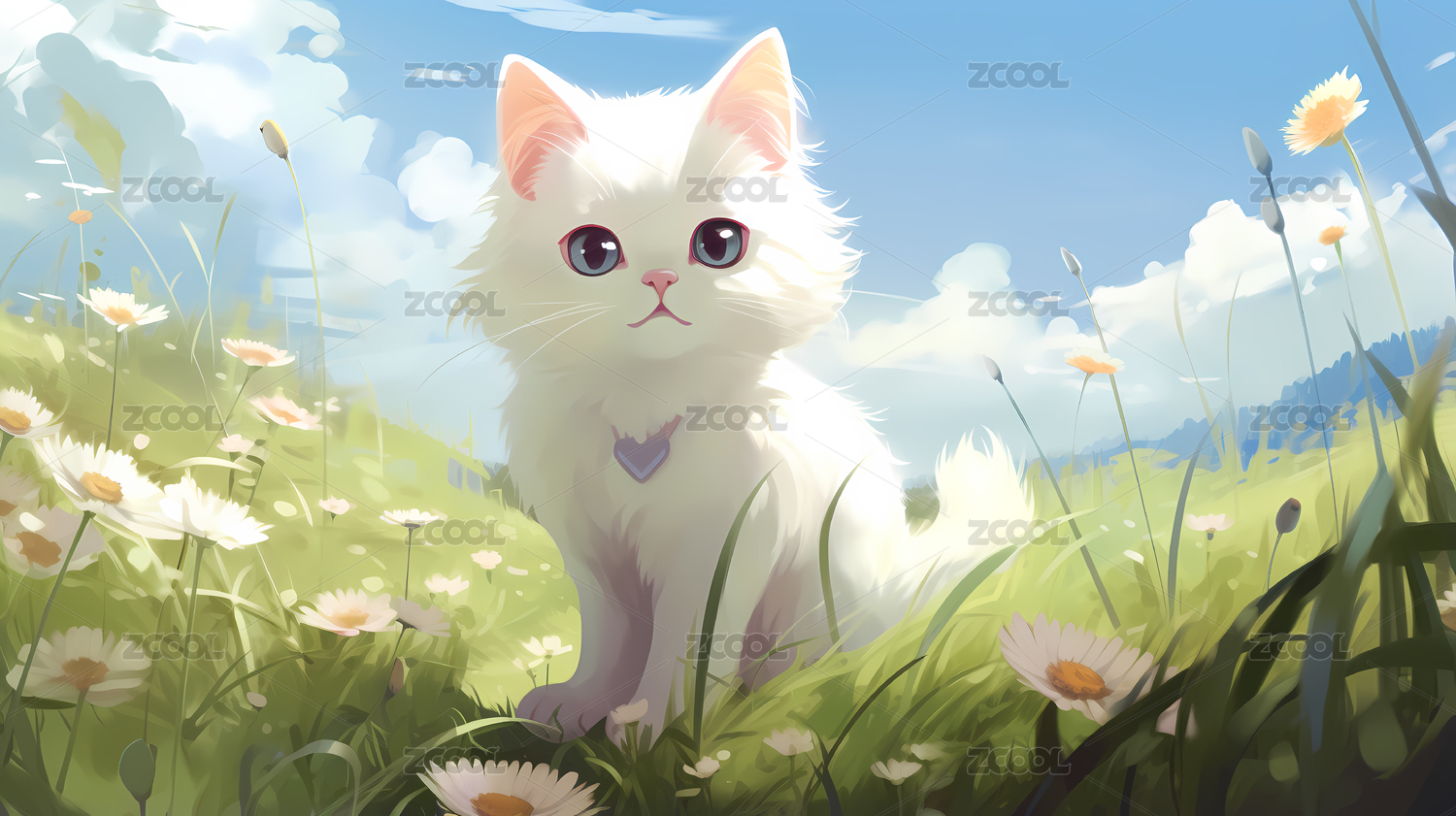 可爱布偶猫在花丛中动物卡通插画壁纸