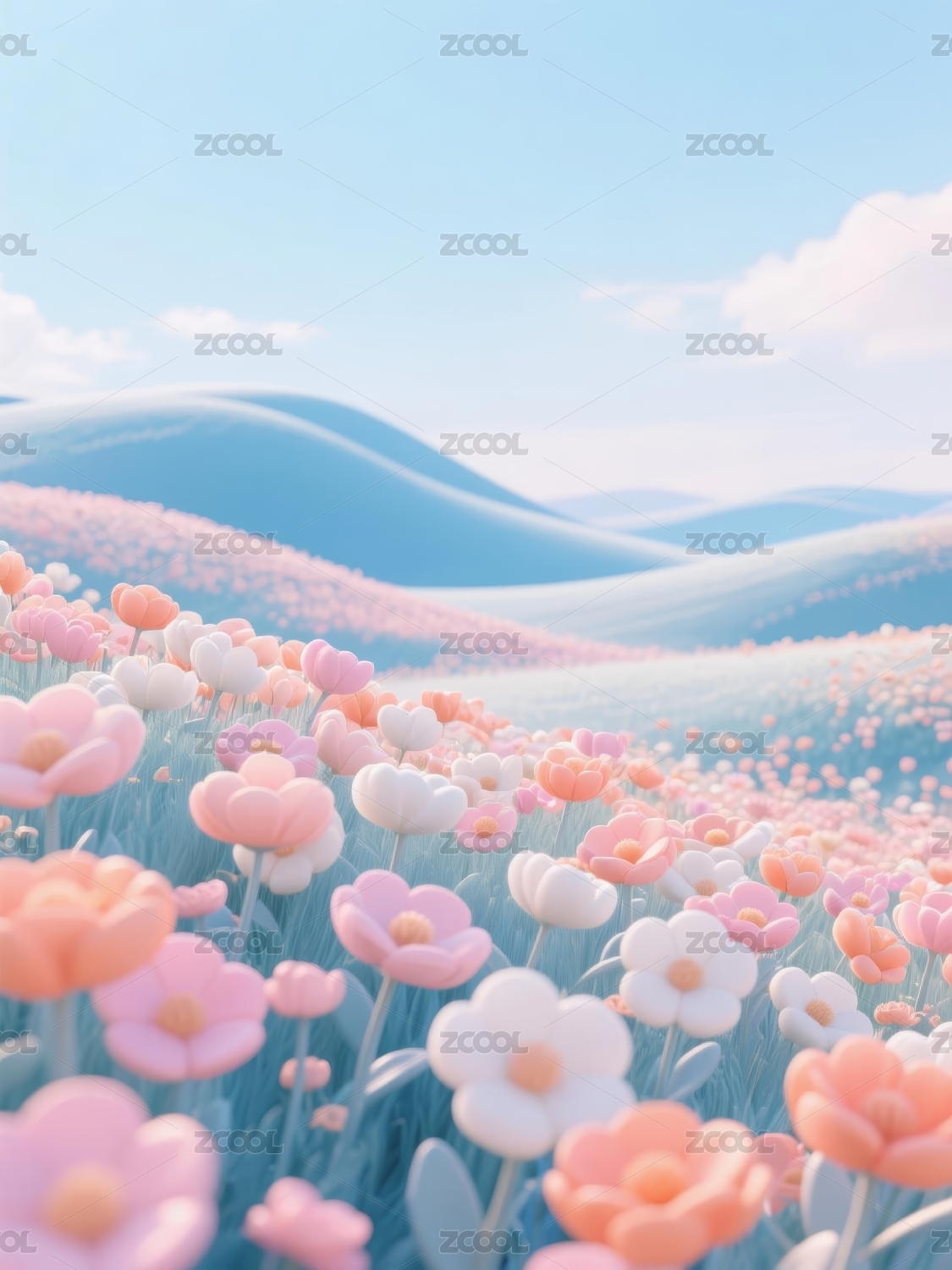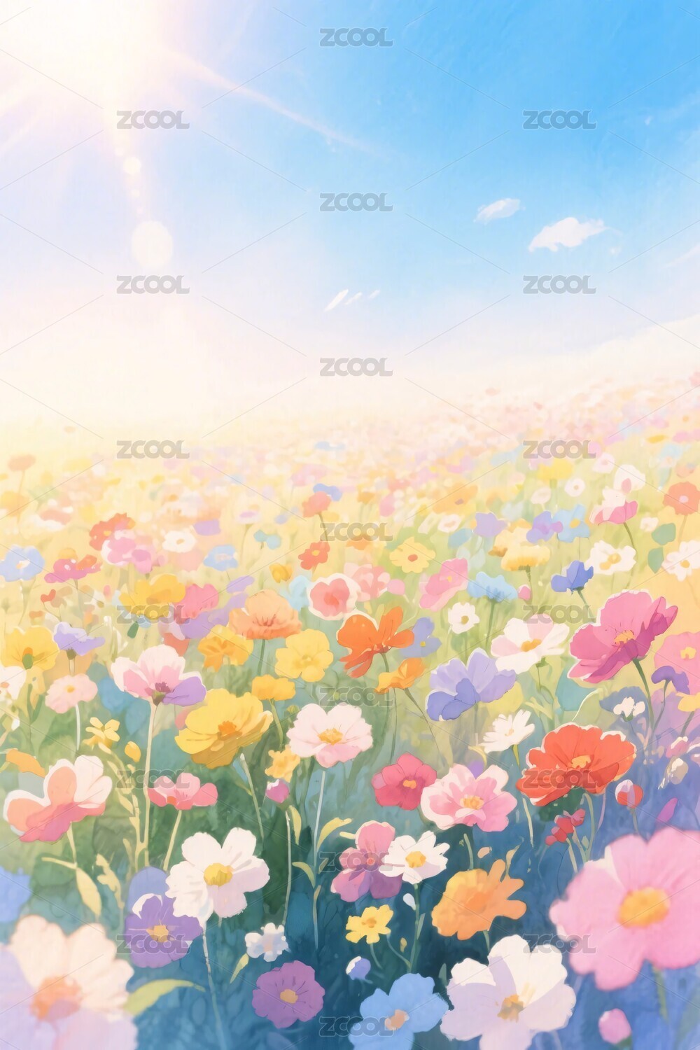 梦幻花田彩色花朵蓝天白云