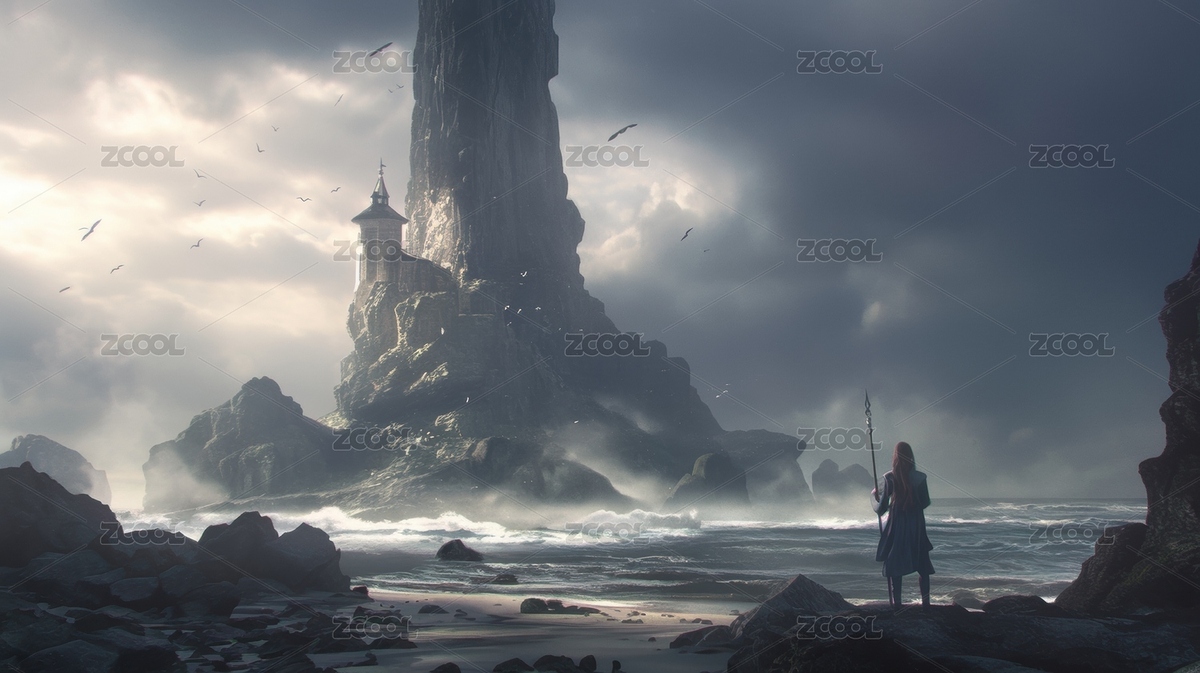 卡通,插画,自然,海边,孤塔,旅人,凝望,岩石,海浪,云雾