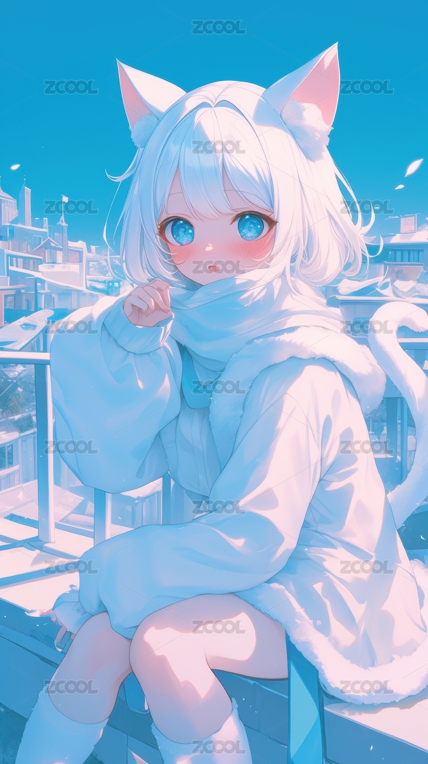 蓝眸猫耳少女屋顶静坐