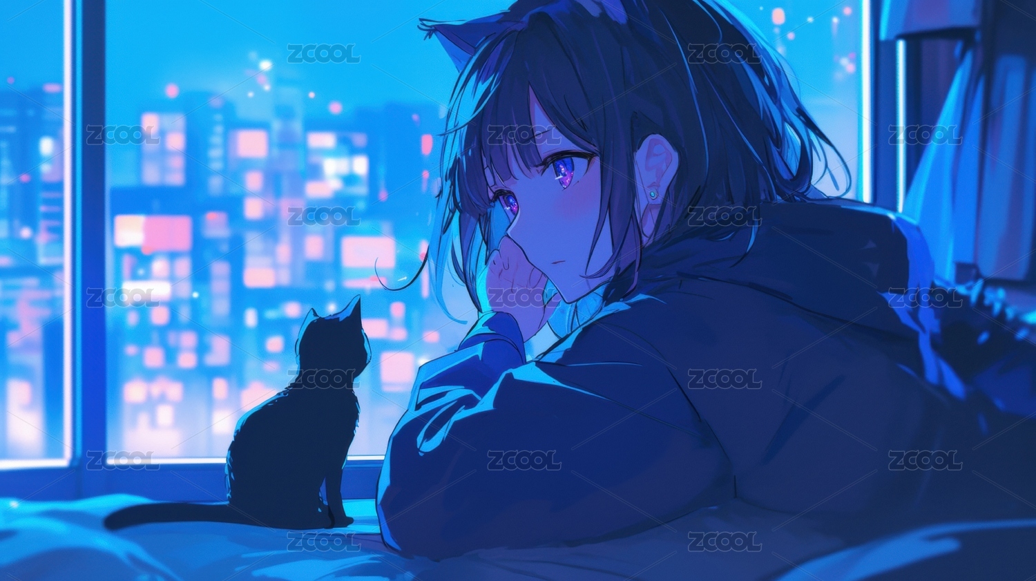 夜景窗前的少女与猫