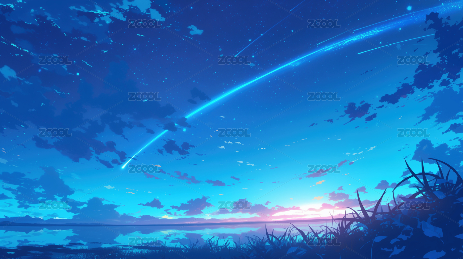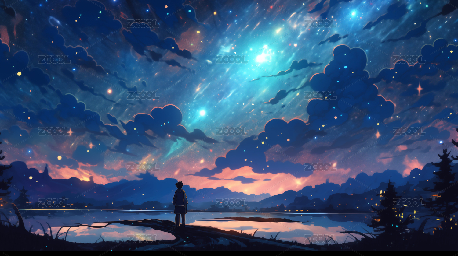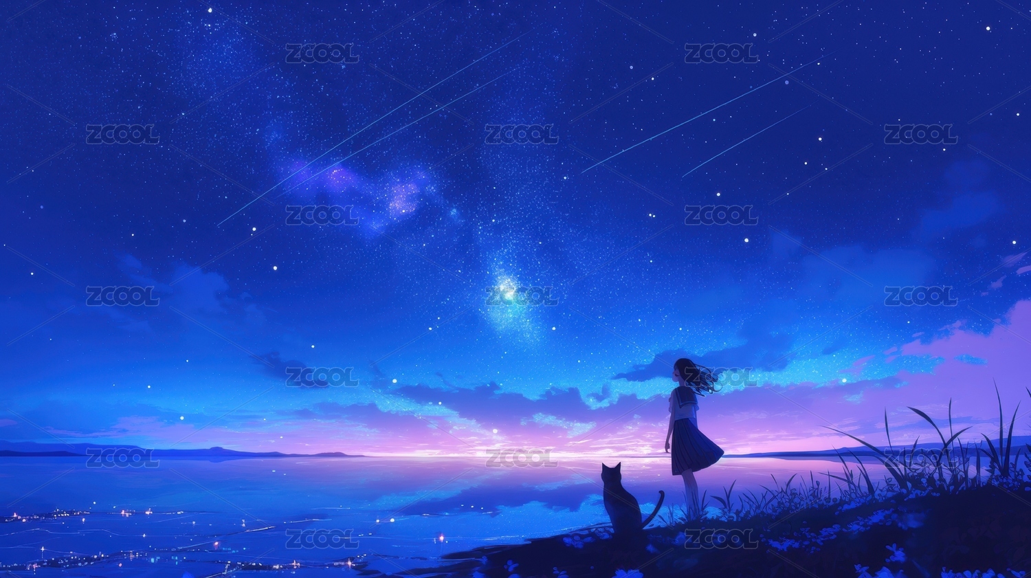 少女,卡通,插画,艺术,风景,户外,自然,明亮,梦幻,蓝色