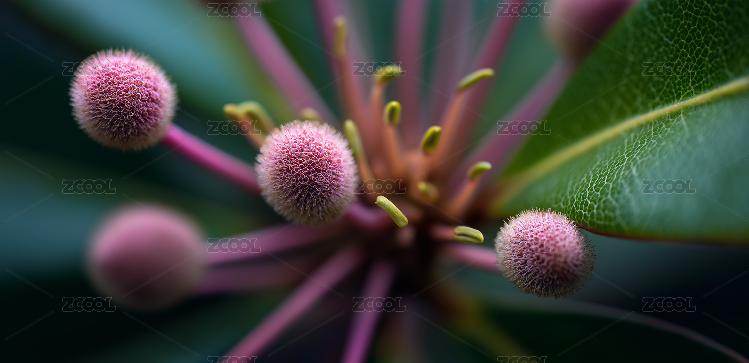特写粉色植物花苞带绒毛与绿叶呈现微观生态