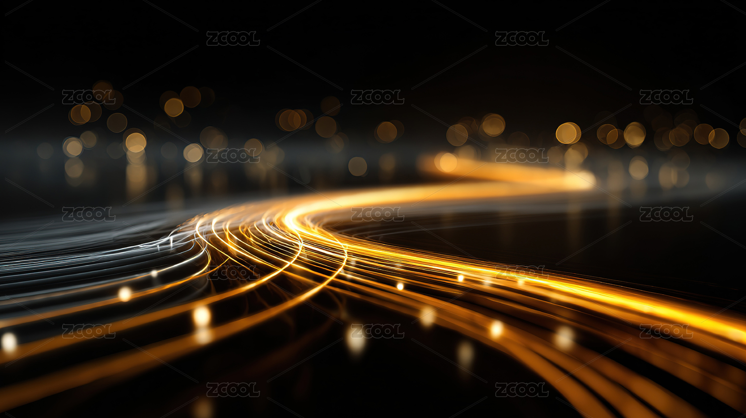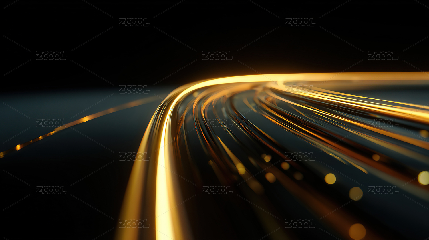 黑色背景上金色光线轨迹呈现动感科技抽象画