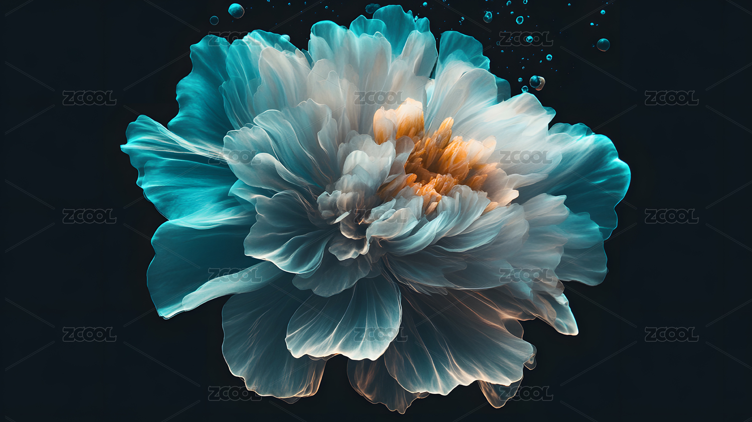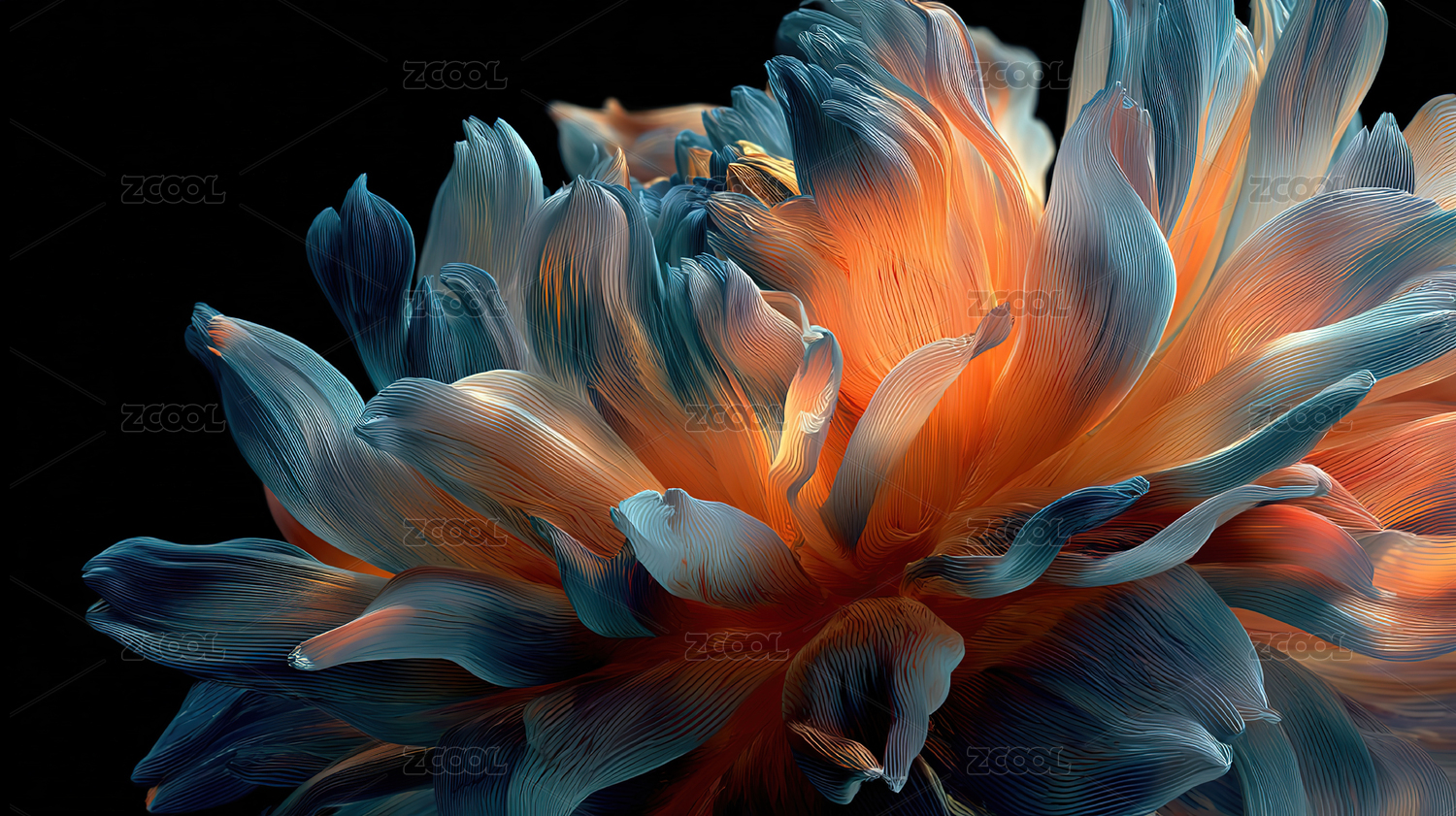 橙色花朵绽放,蓝色背景,梦幻唯美