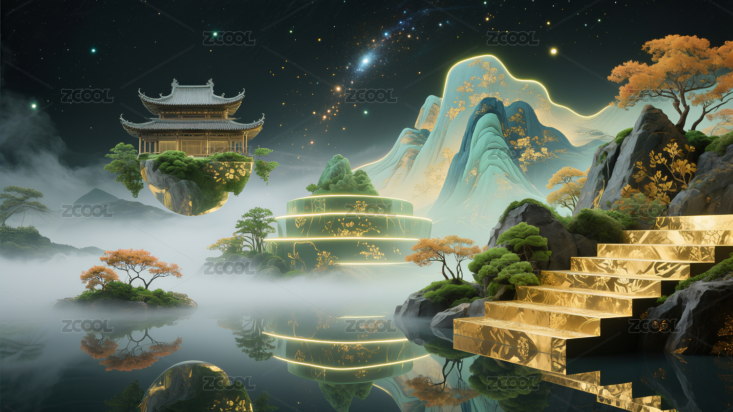 前卫,时尚,梦幻,立体,宇宙,楼阁,台阶,山峰,湖面,金箔
