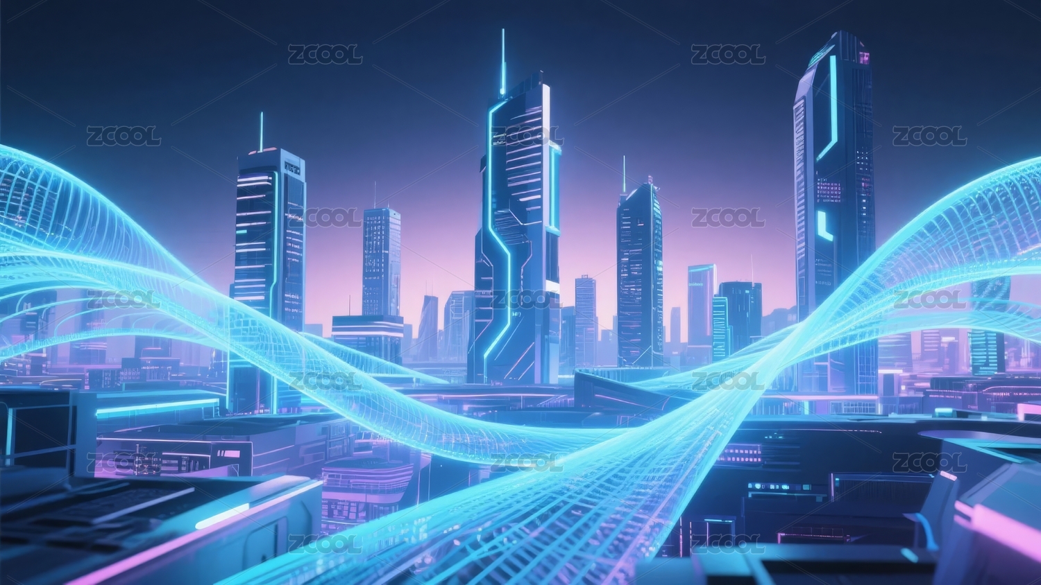 抽象数据流线条发光未来城市轮廓蓝紫色渐变