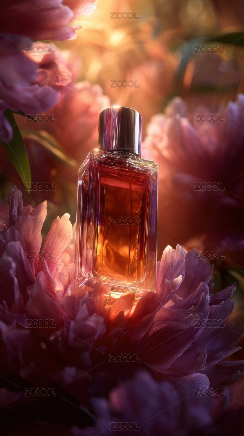 香水瓶置于花蕊中光影交织