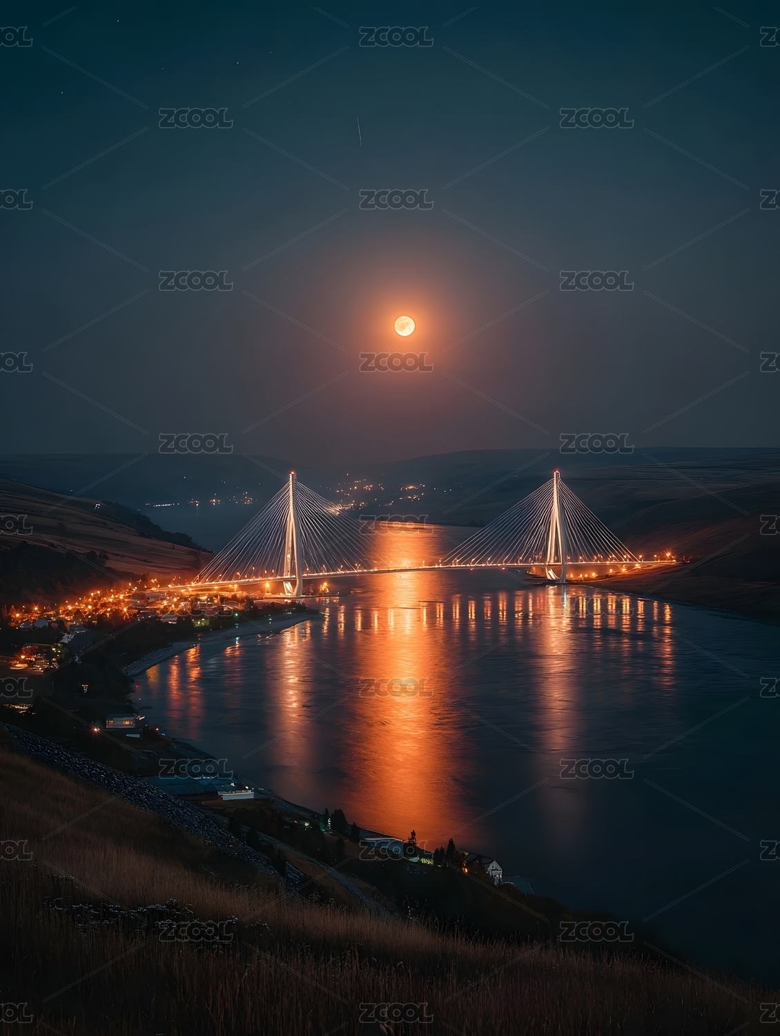 满月悬桥夜景