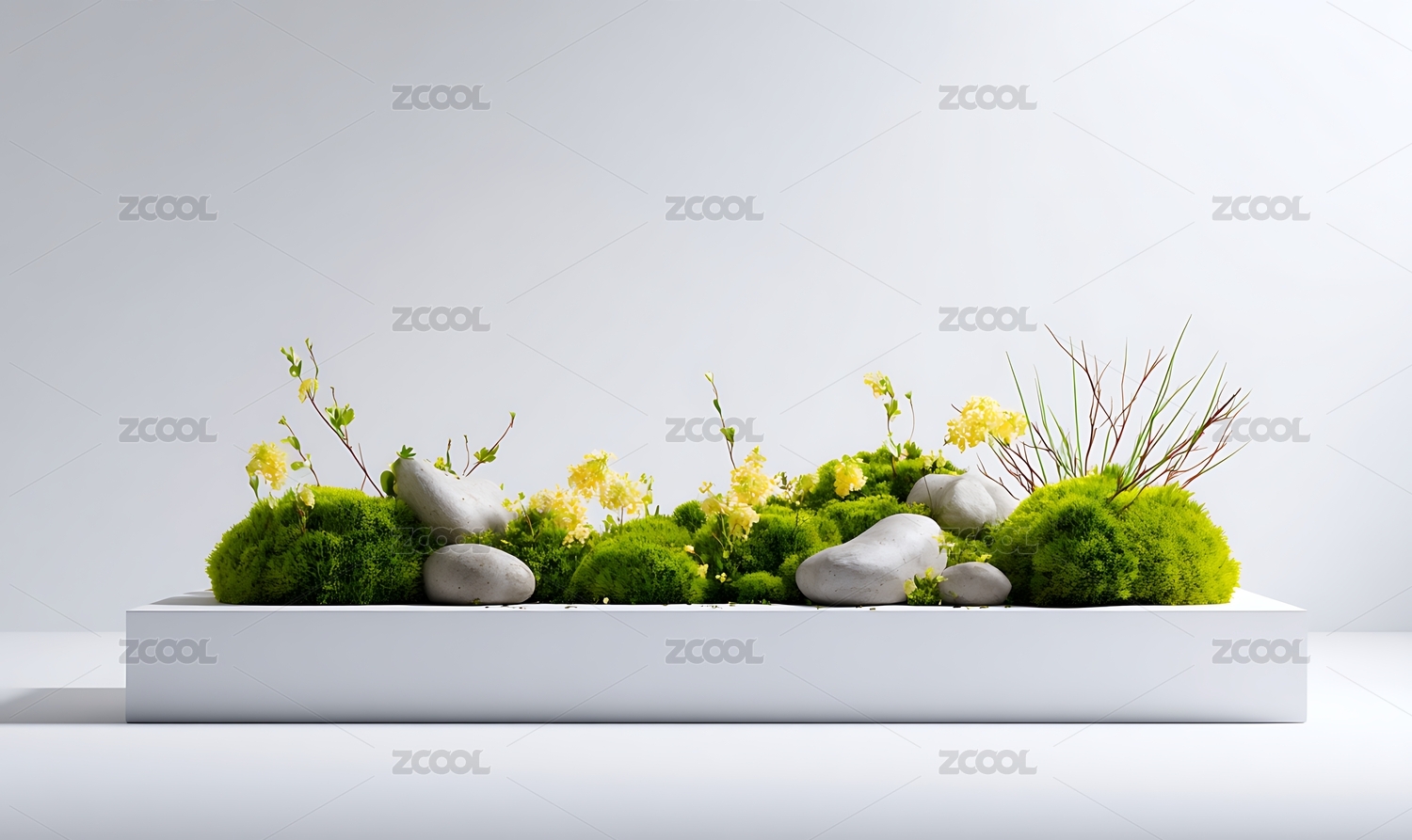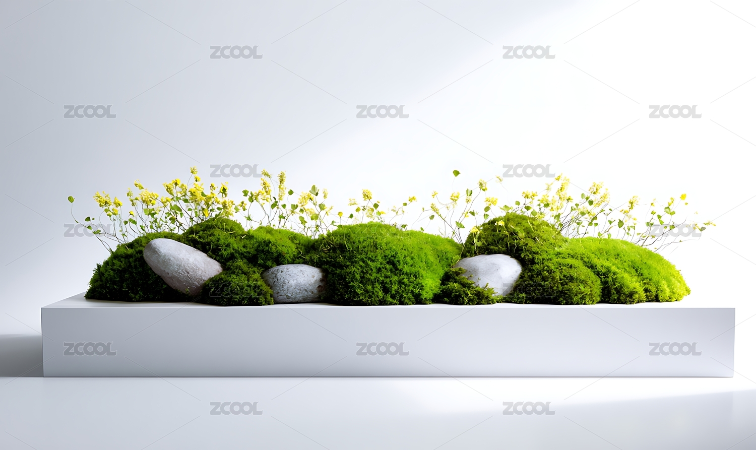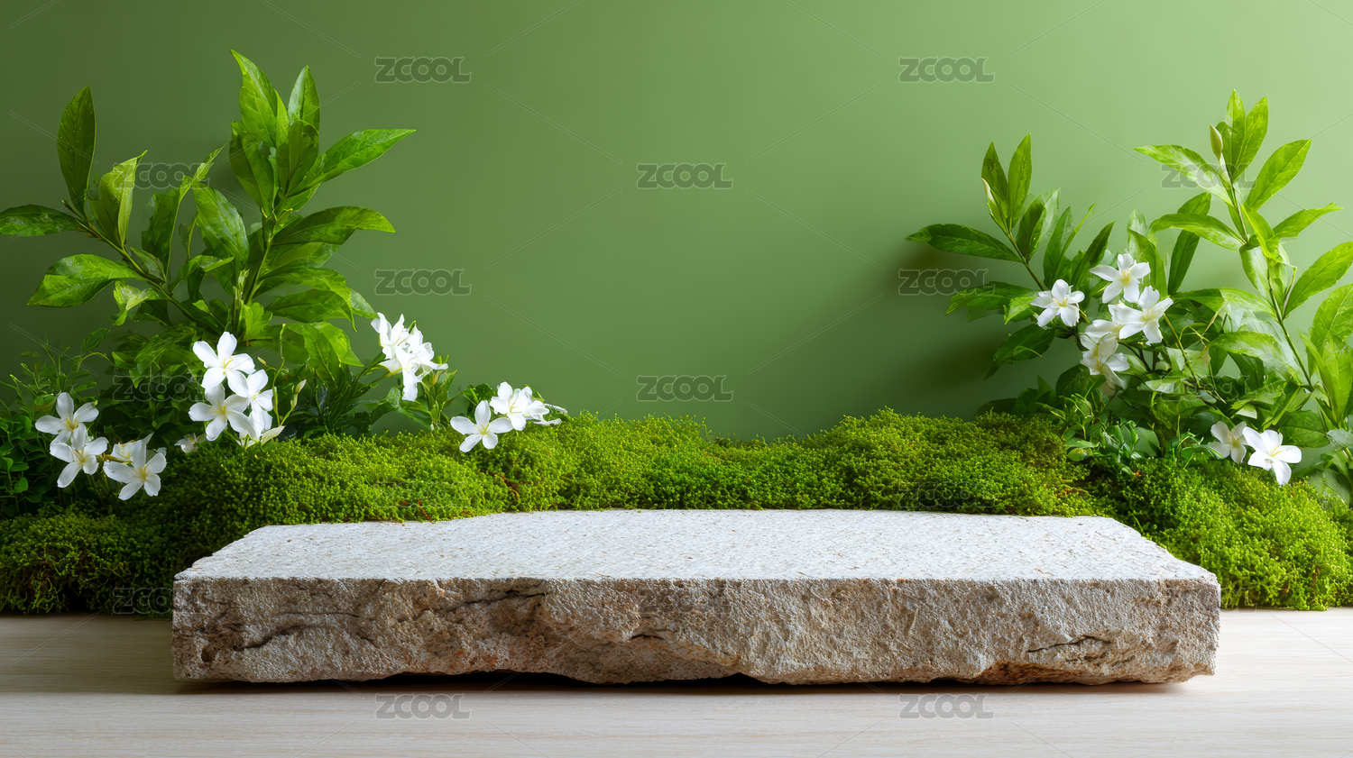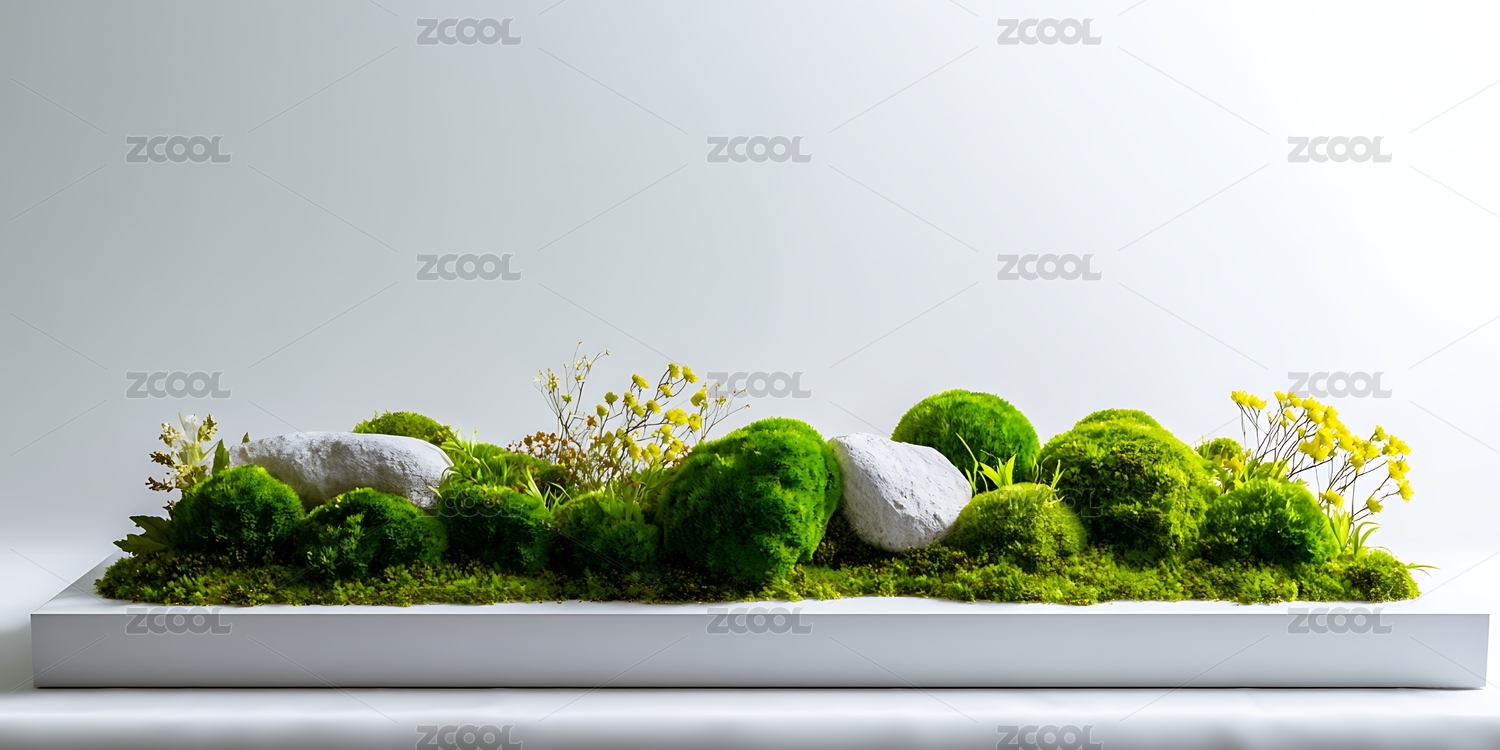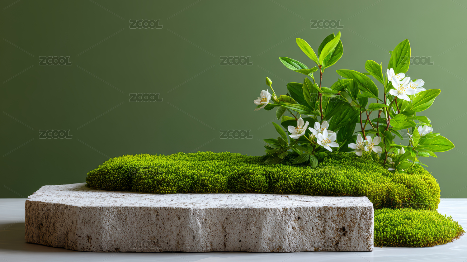 陈列台,绿色背景,清新,自然,苔藓,白色石台,植物,叶子,花卉,小清新