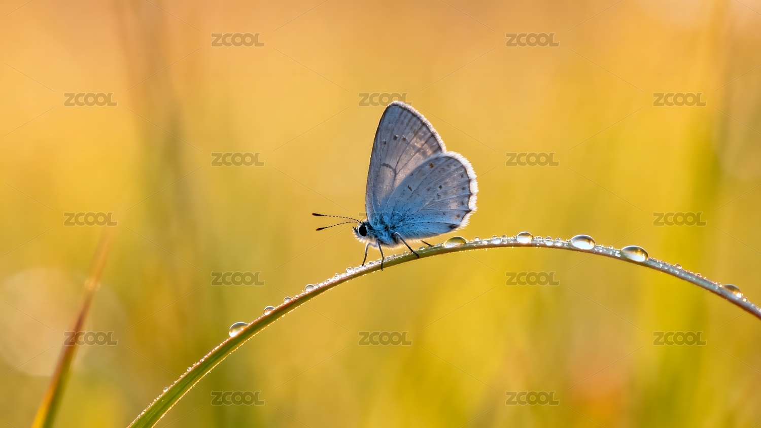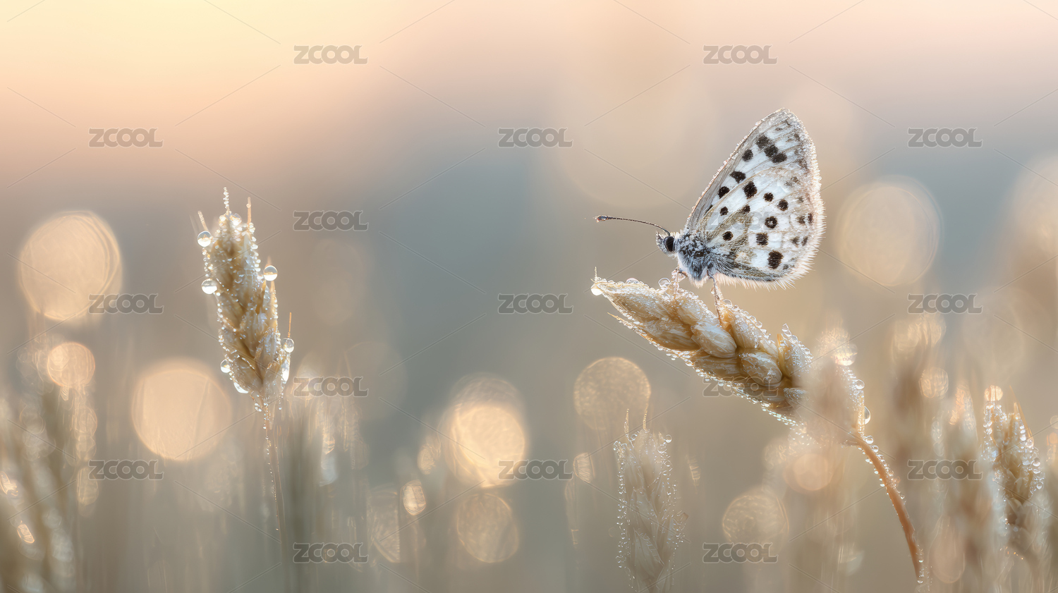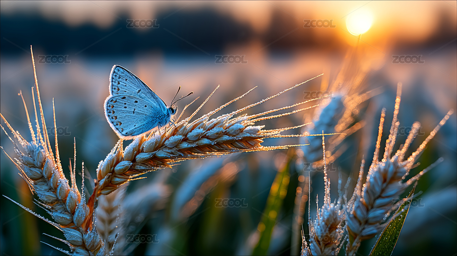 轻盈蓝色蝴蝶翅膀小麦麦穗背景