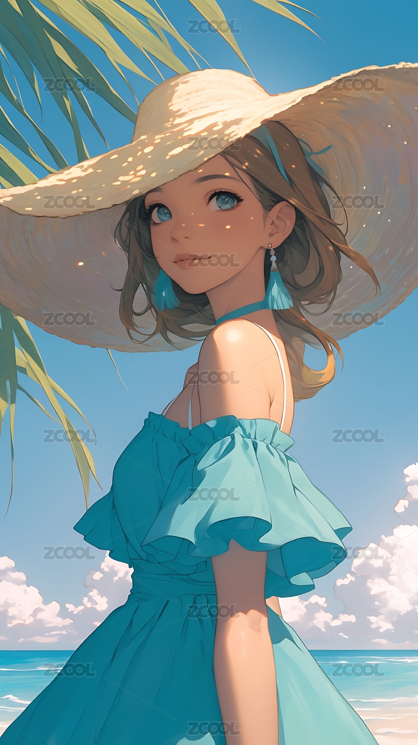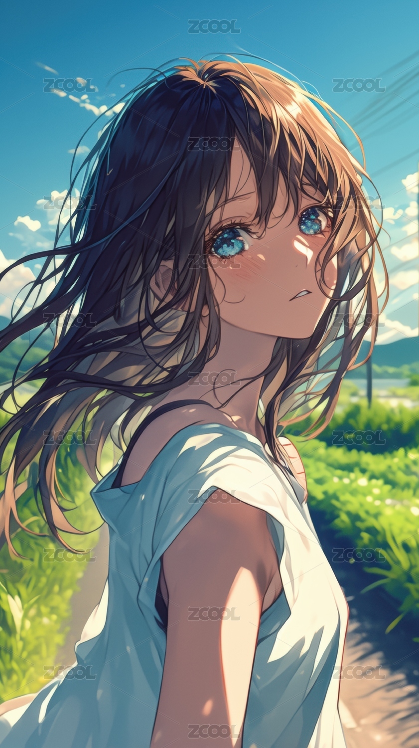 少女,插画,漫画,动漫,日漫,背景,自然,蓝天,白云,美丽