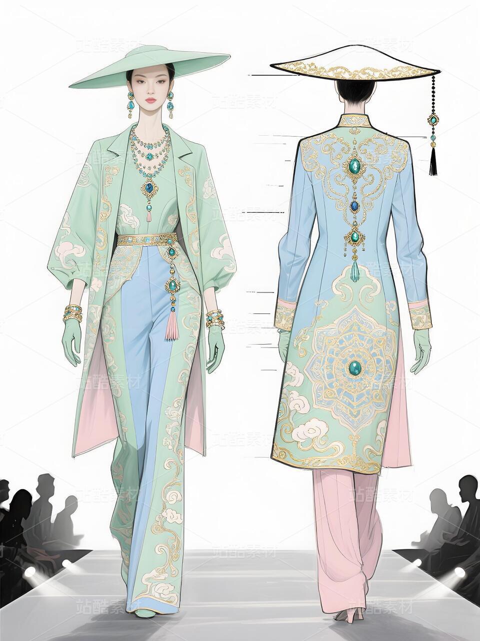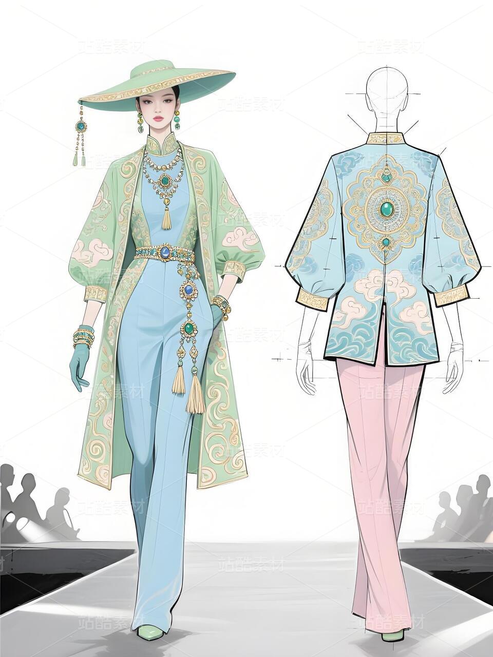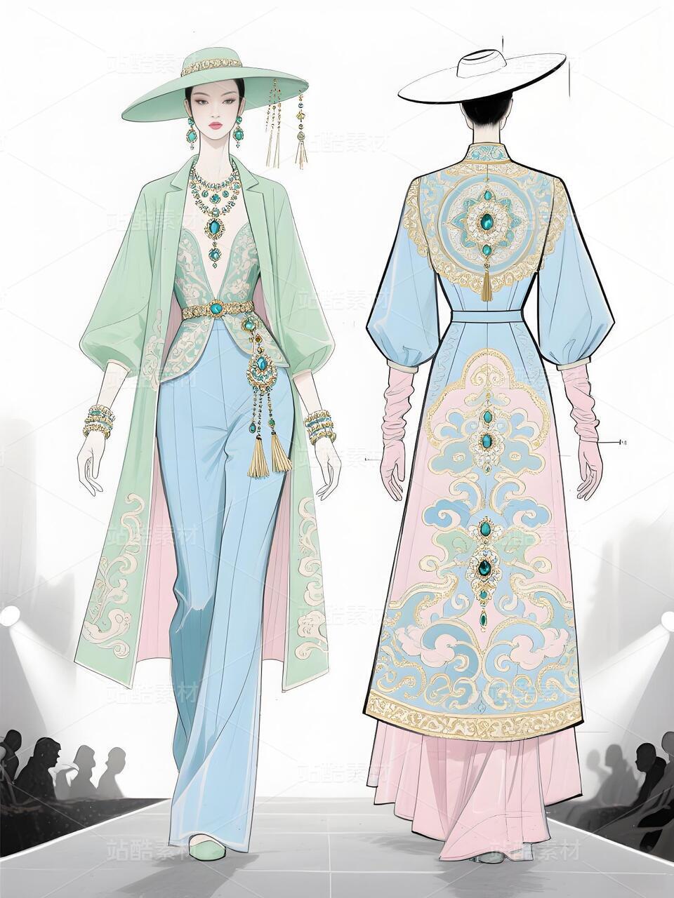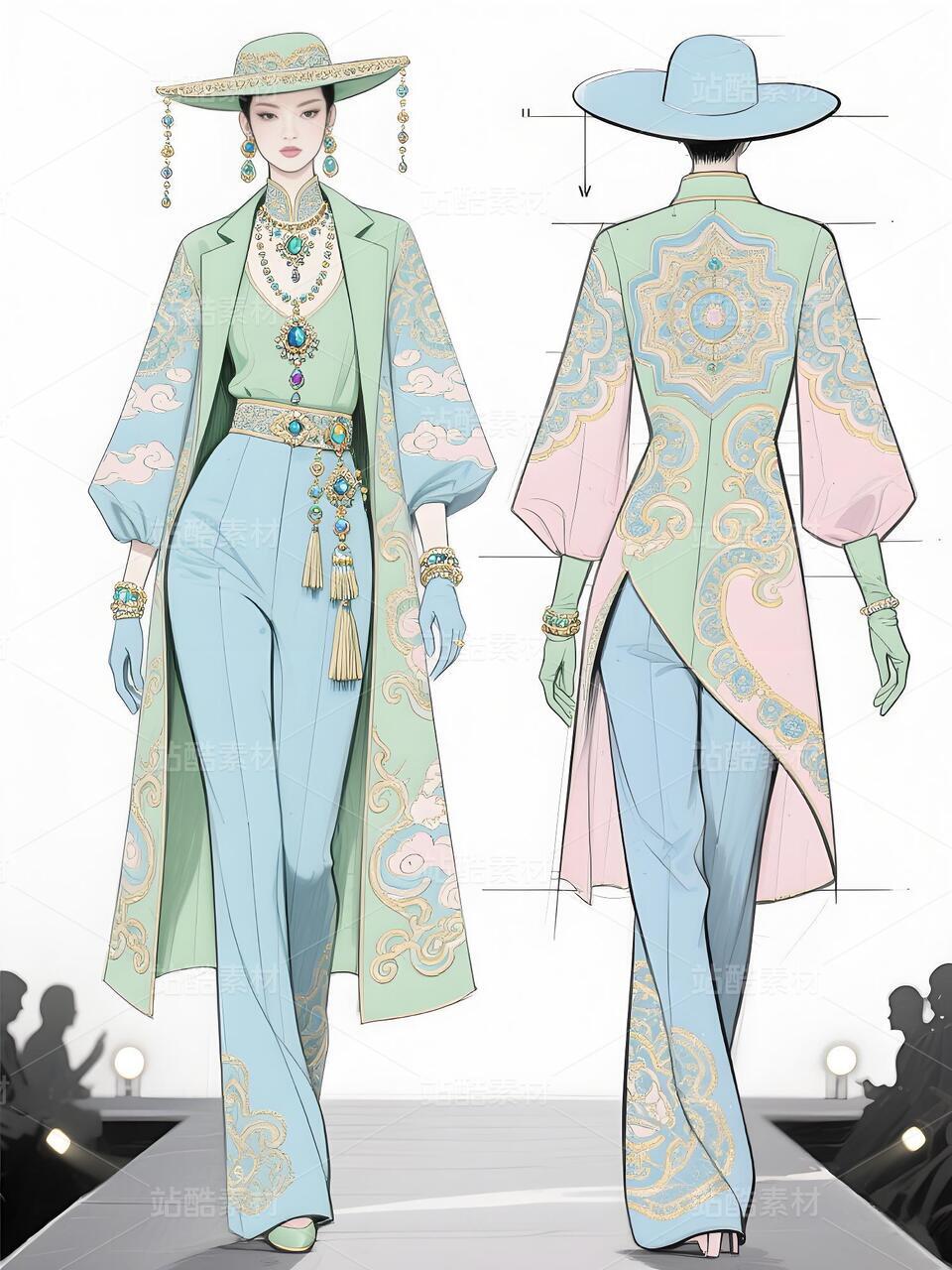 本系列以敦煌藻井璎珞纹样为数字灵感源,通过3D建模技术将石窟艺术转化为未来感高定作品。浅绿与浅蓝的霓虹渐变呈现数码敦煌的奇幻视效,礼服上的发光璎珞纹采用电解绣工艺再现千年纹样。外套创新采用3D打印镂空结构,裤装侧缝嵌有LED灯带勾勒藻井几何线条。智能织物制成的渐变手套可与T台灯光互动,穹顶造型的帽子融合现代建筑美学与藻井结构。九宫格完整呈现从数字线稿到发光成衣的创作全过程,在虚拟与现实交织的秀场中开启时尚元宇宙新纪元。