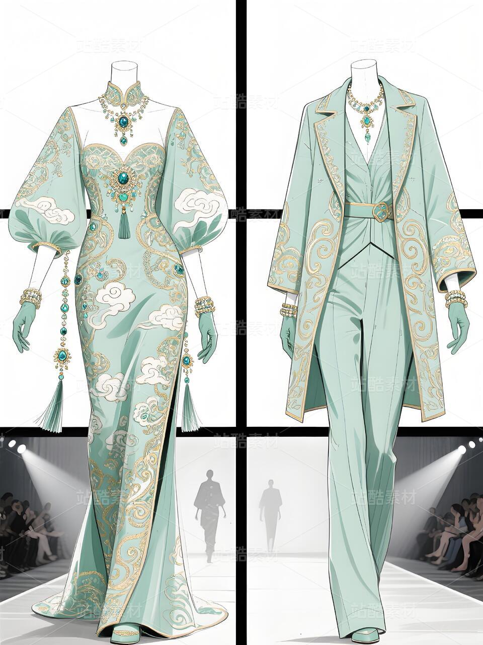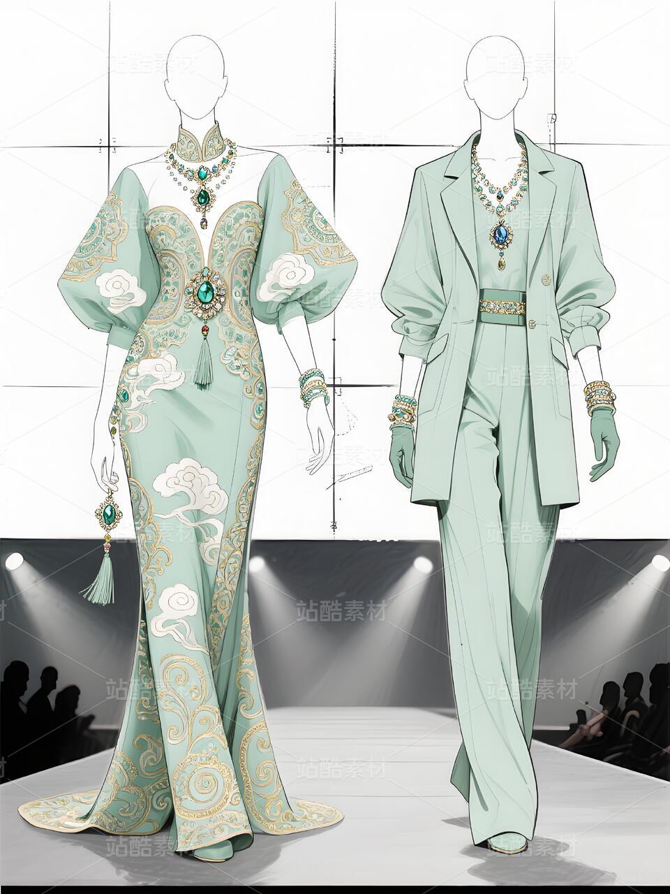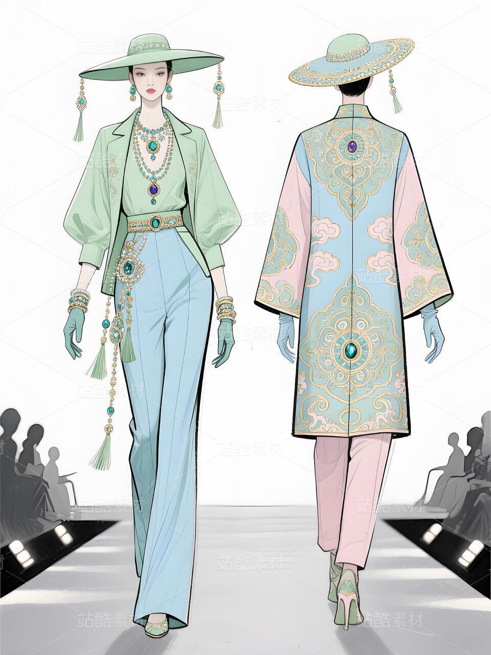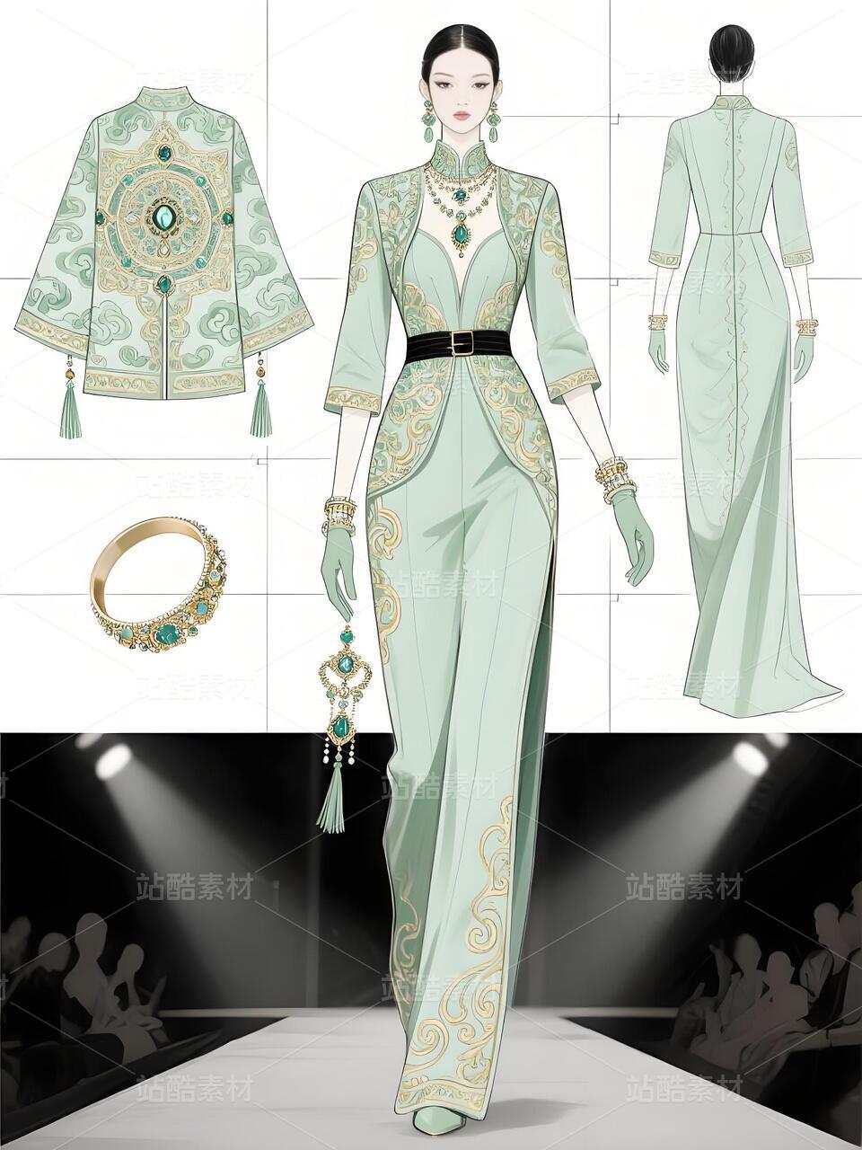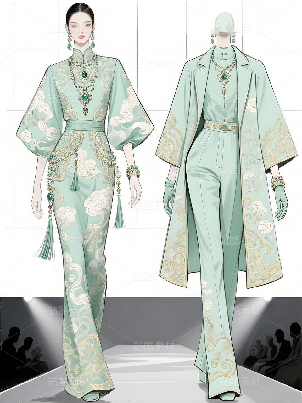 本系列以敦煌藻井璎珞纹样为数字灵感源,通过3D建模技术将石窟艺术转化为未来感高定作品。浅绿与浅蓝的霓虹渐变呈现数码敦煌的奇幻视效,礼服上的发光璎珞纹采用电解绣工艺再现千年纹样。外套创新采用3D打印镂空结构,裤装侧缝嵌有LED灯带勾勒藻井几何线条。智能织物制成的渐变手套可与T台灯光互动,穹顶造型的帽子融合现代建筑美学与藻井结构。九宫格完整呈现从数字线稿到发光成衣的创作全过程,在虚拟与现实交织的秀场中开启时尚元宇宙新纪元。