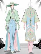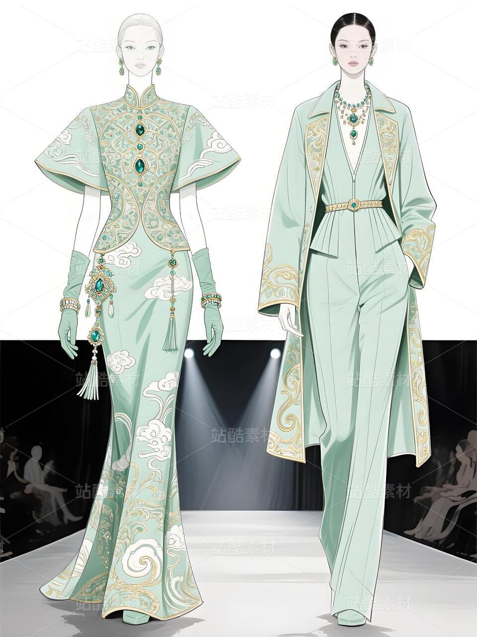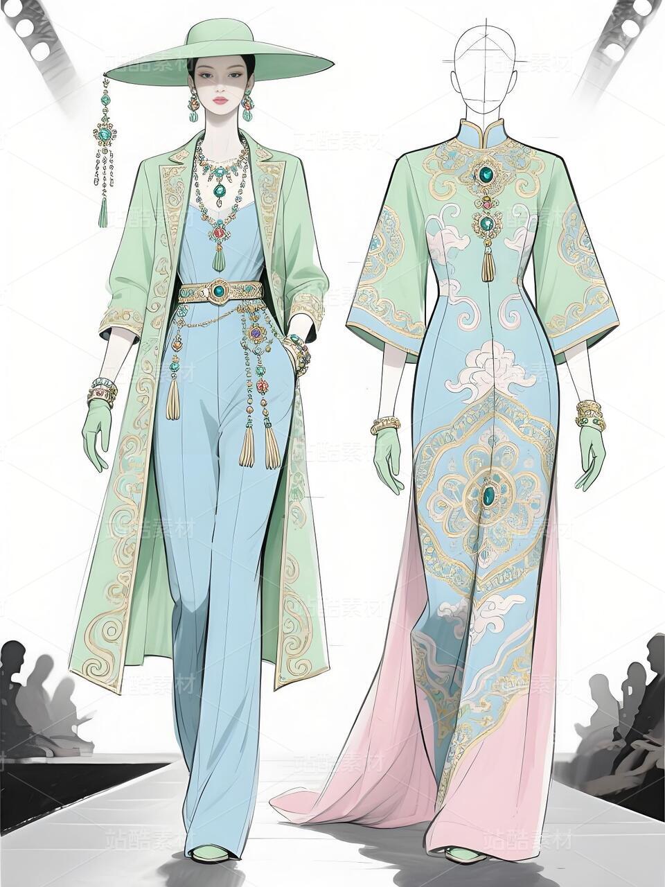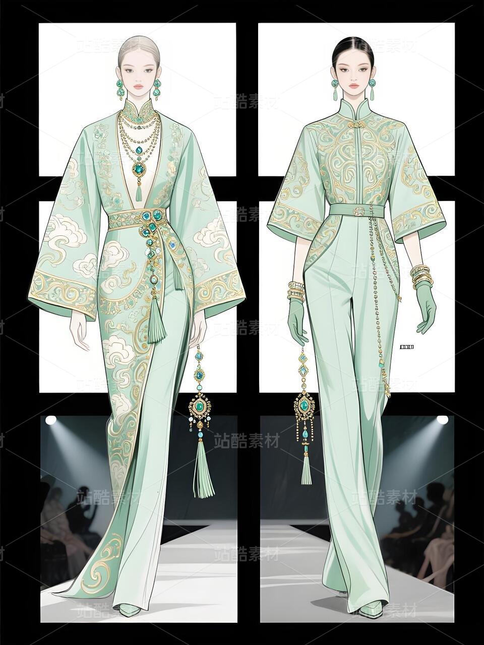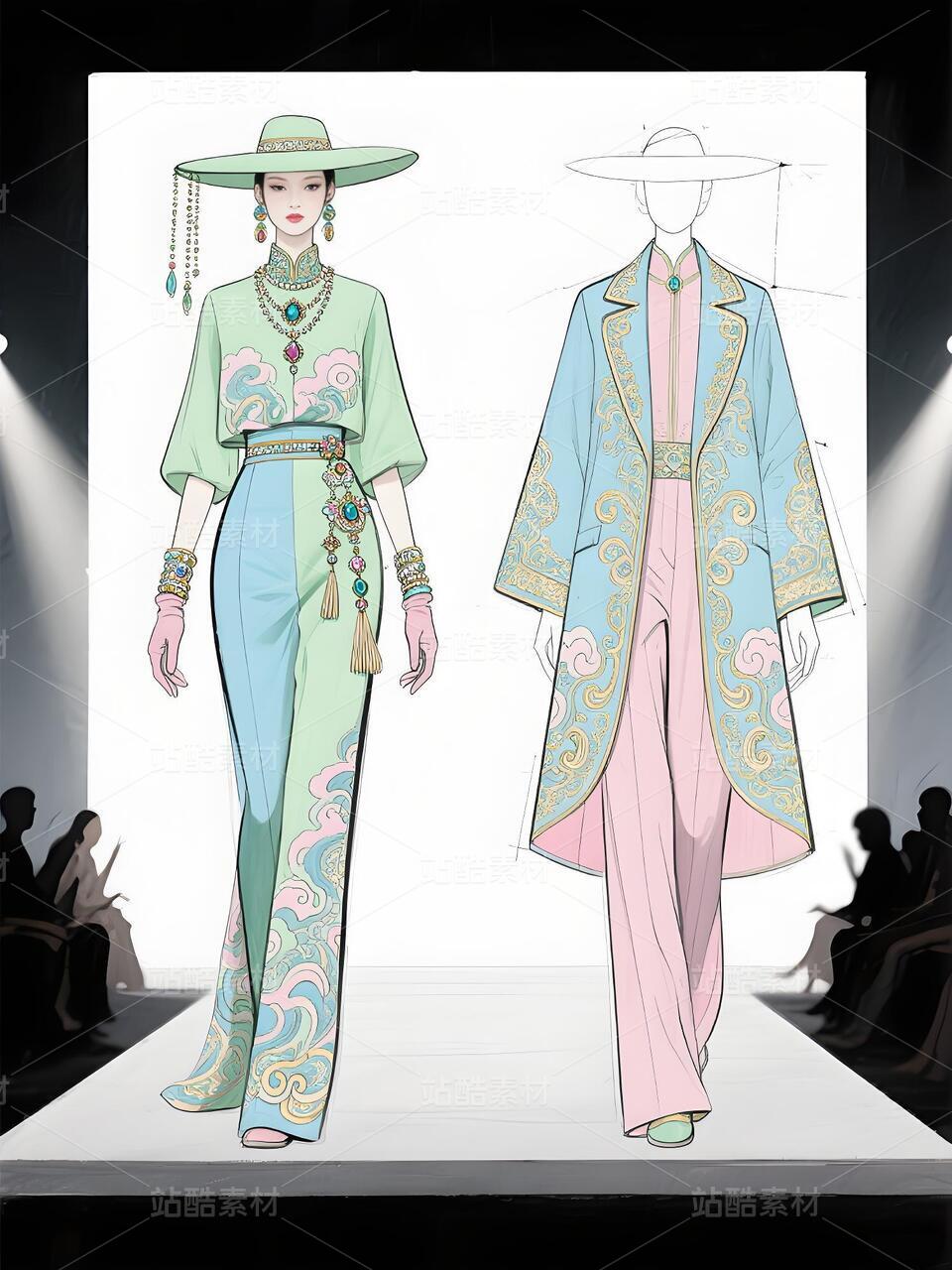 本系列以敦煌藻井璎珞纹样为数字灵感源,通过3D建模技术将石窟艺术转化为未来感高定作品。浅绿与浅蓝的霓虹渐变呈现数码敦煌的奇幻视效,礼服上的发光璎珞纹采用电解绣工艺再现千年纹样。外套创新采用3D打印镂空结构,裤装侧缝嵌有LED灯带勾勒藻井几何线条。智能织物制成的渐变手套可与T台灯光互动,穹顶造型的帽子融合现代建筑美学与藻井结构。九宫格完整呈现从数字线稿到发光成衣的创作全过程,在虚拟与现实交织的秀场中开启时尚元宇宙新纪元。