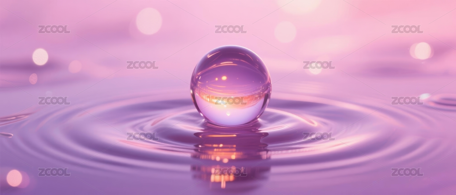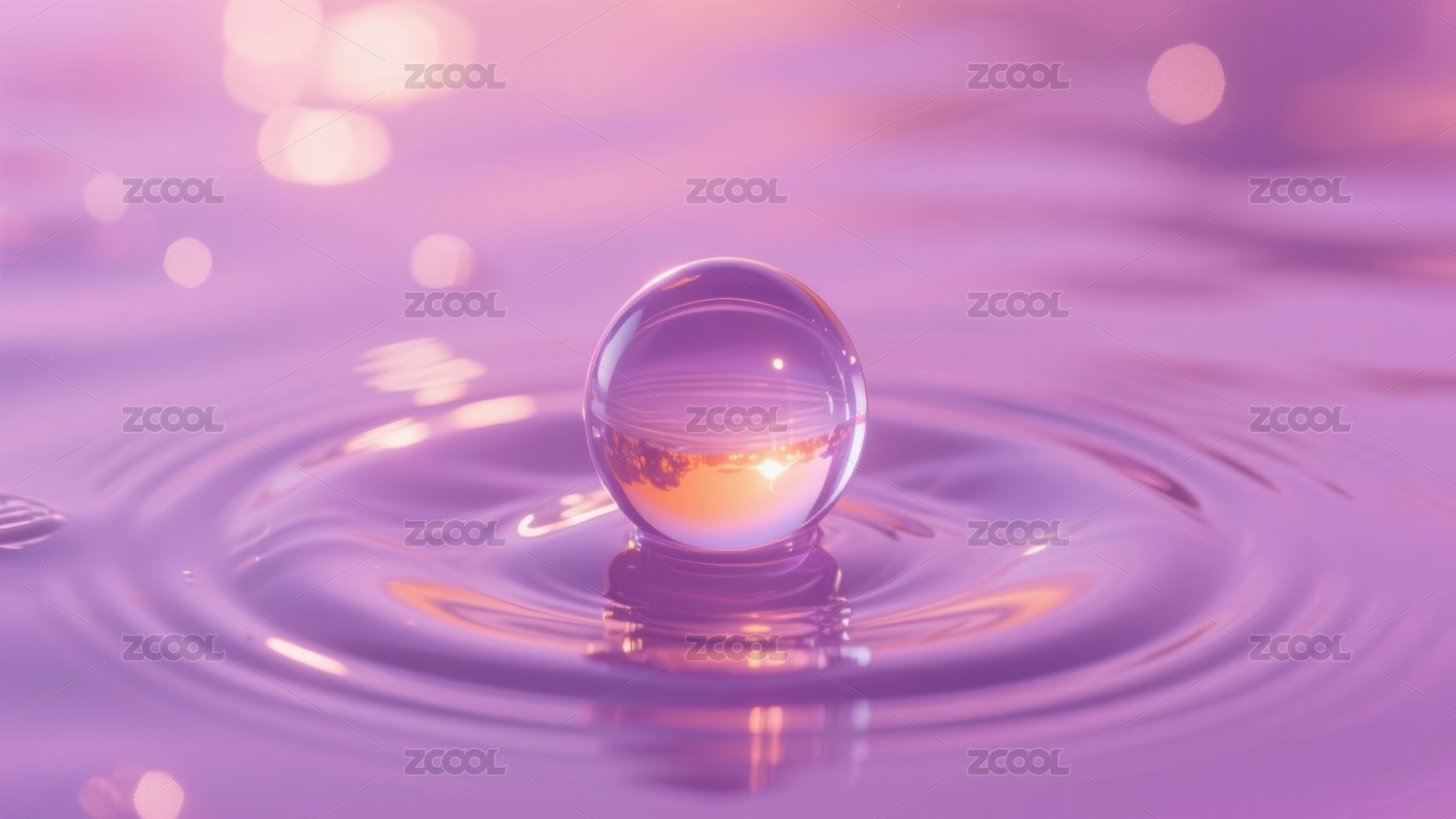 水滴悬浮在平静的海面上,背景是绚丽的日落
