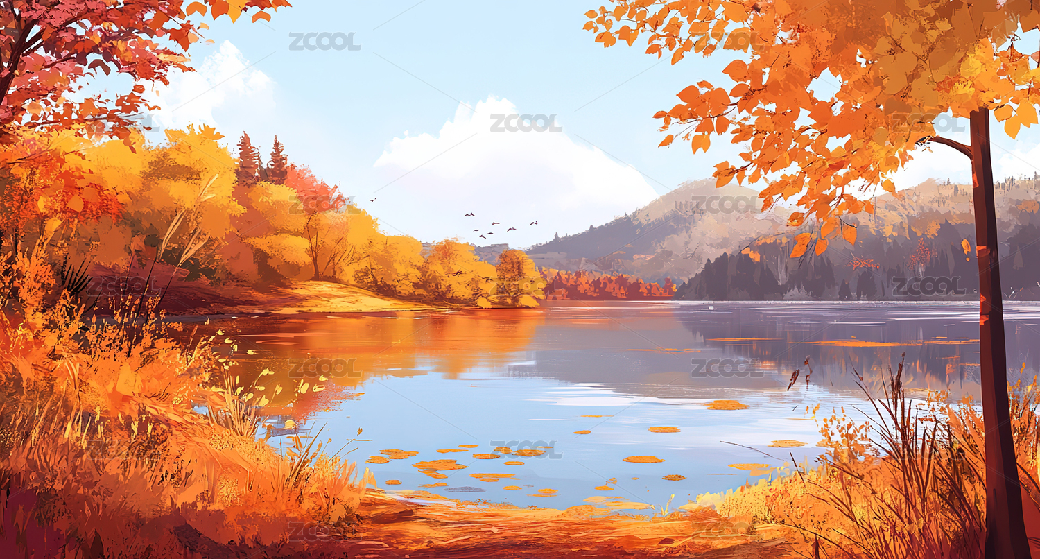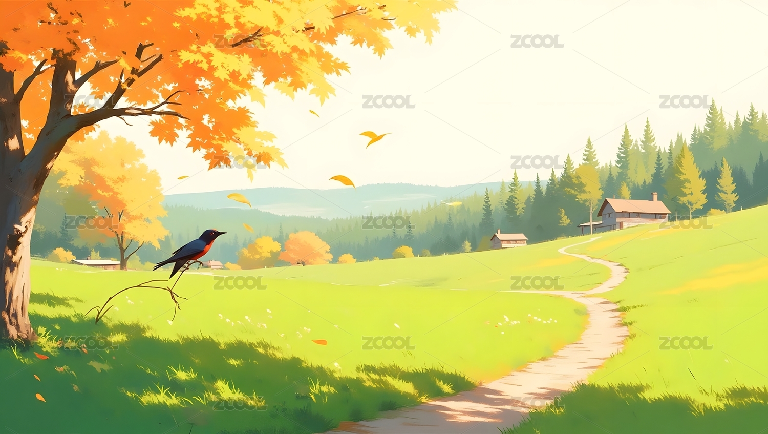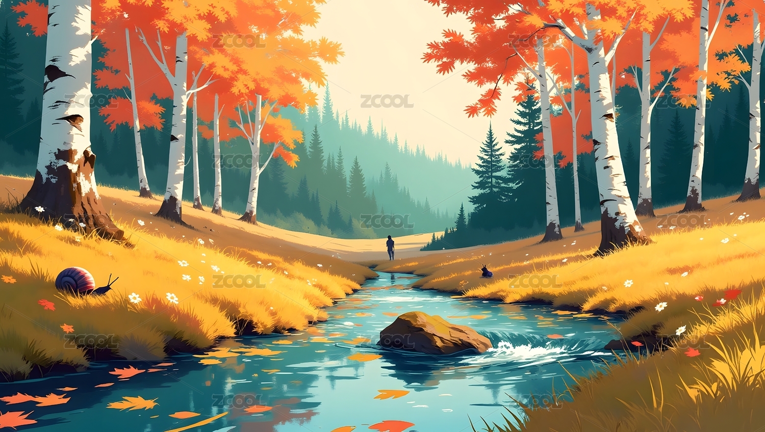 溪流,小桥,树木,蘑菇,树叶,小鸟,秋天,自然,风景,卡通