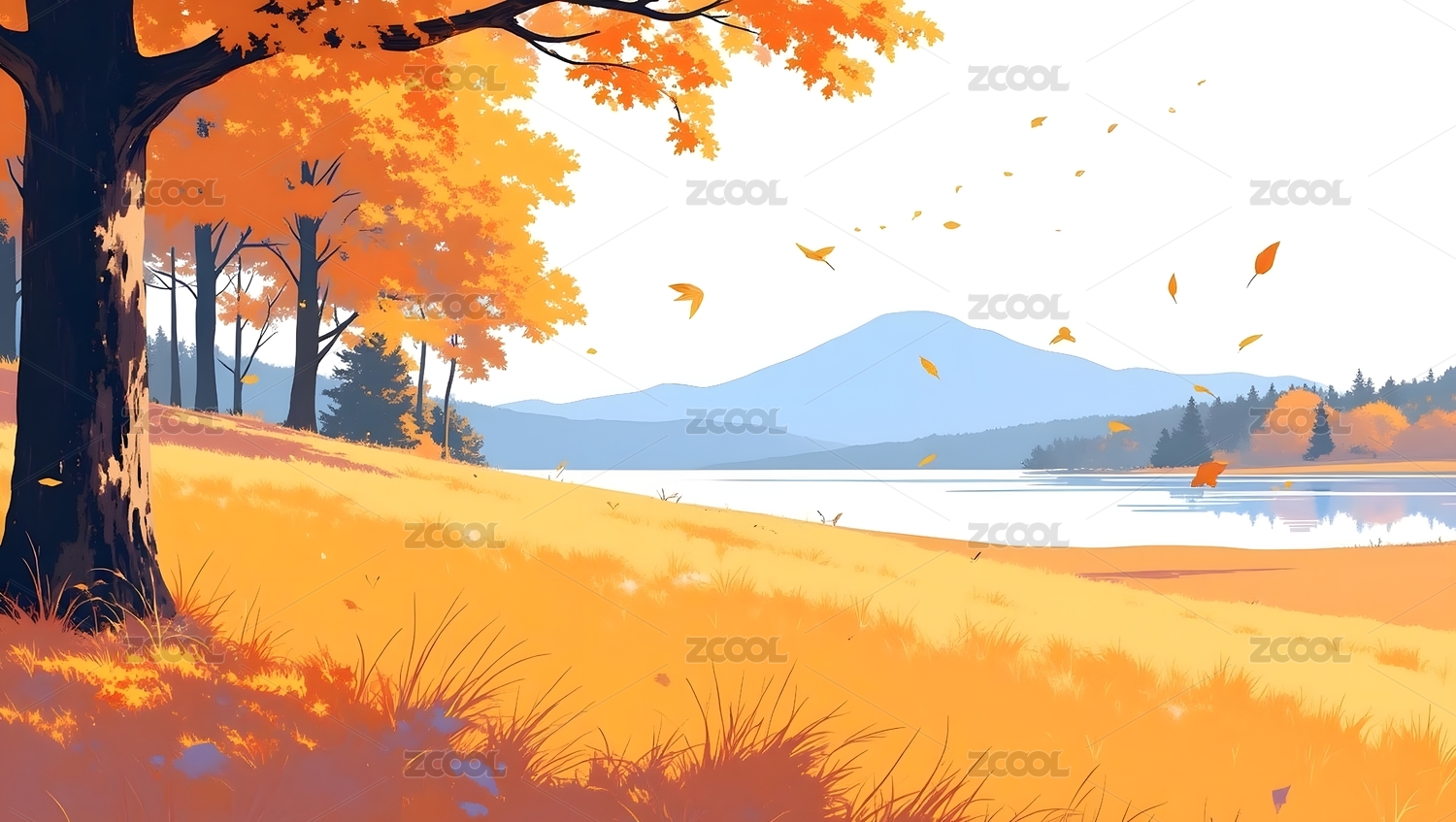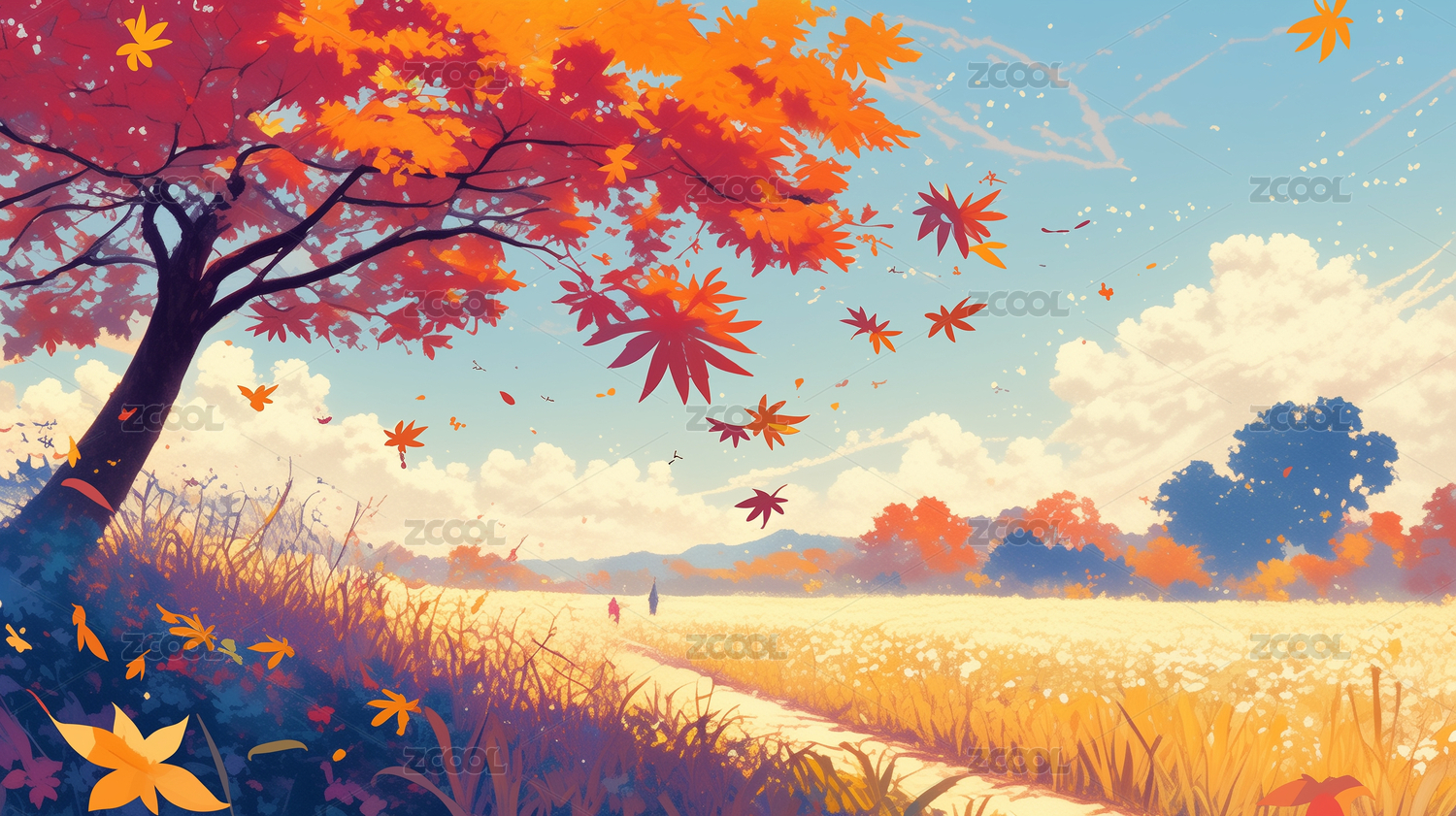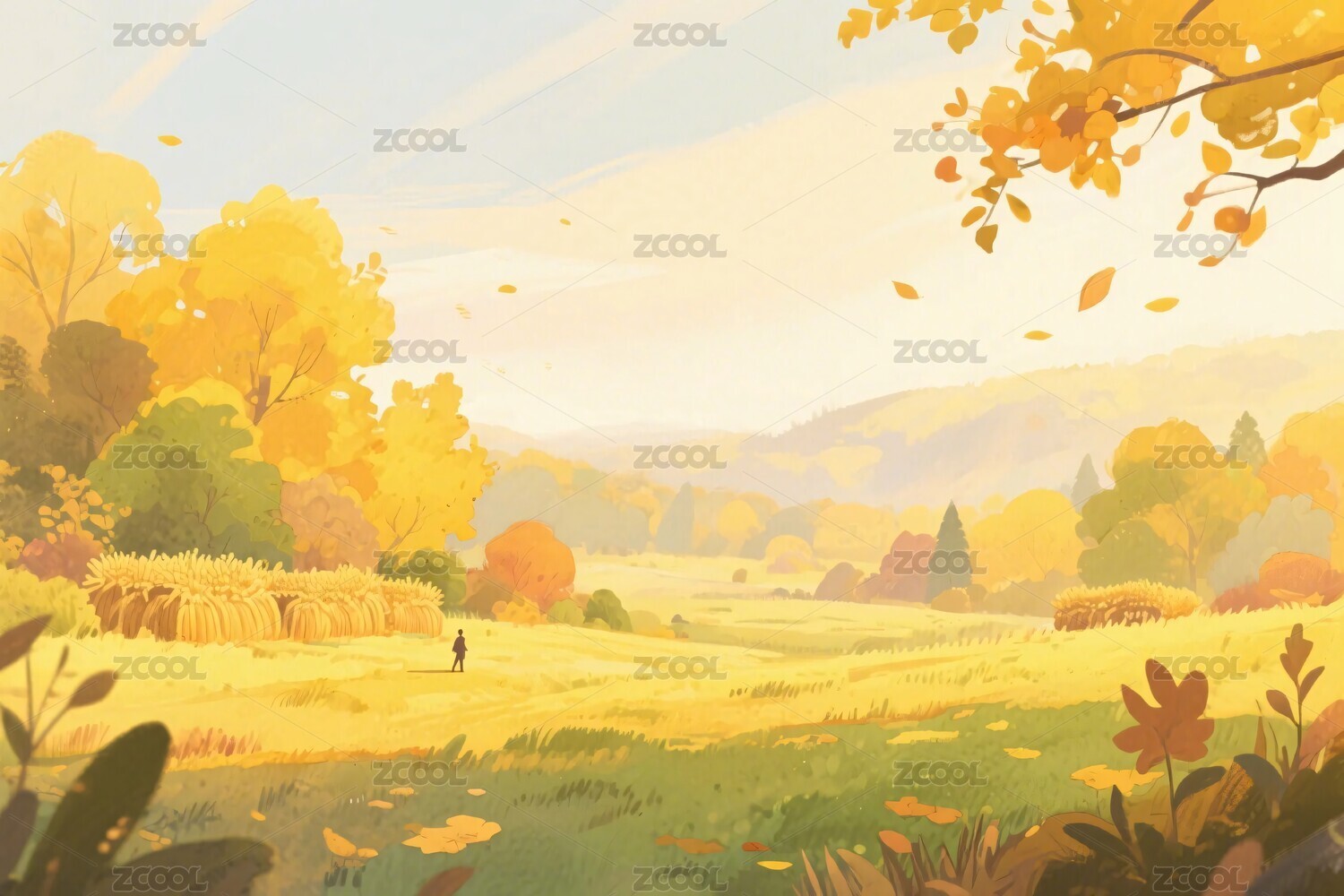 溪流,小桥,树木,蘑菇,树叶,小鸟,秋天,自然,风景,卡通
