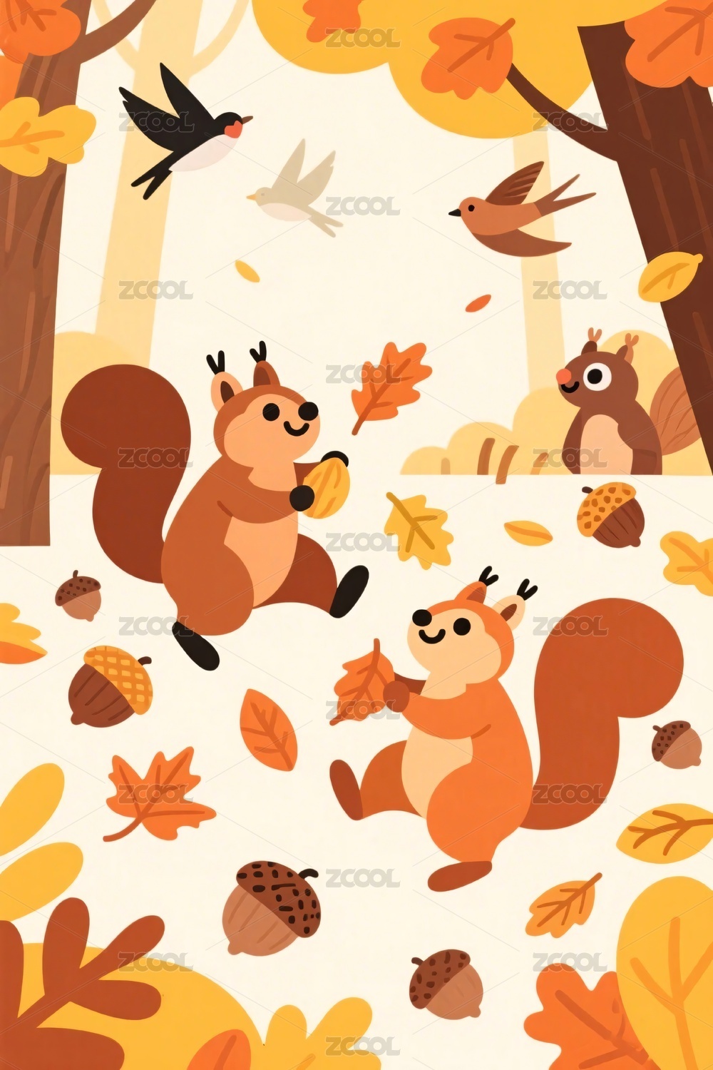 秋日松鼠小鸟插画