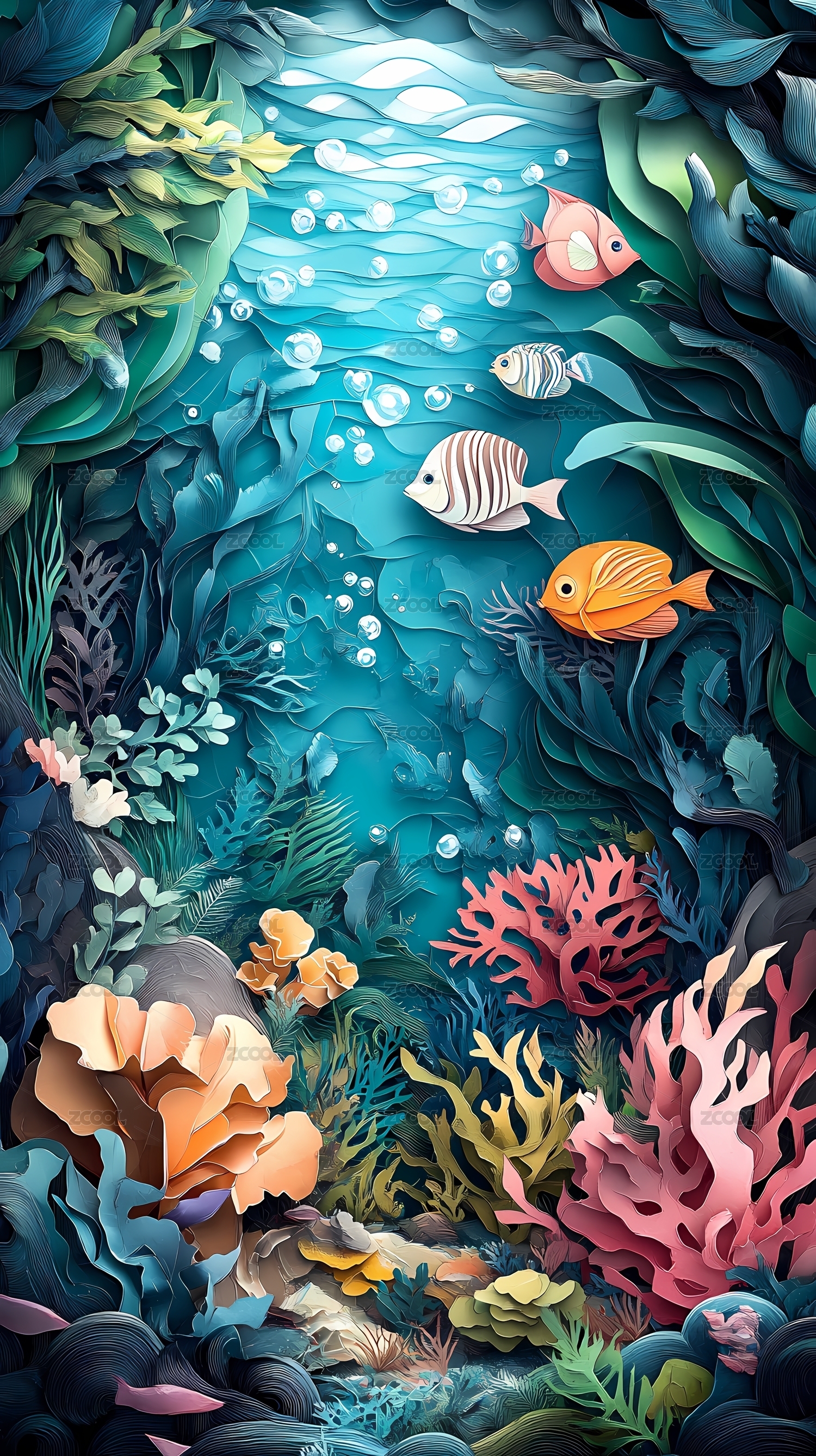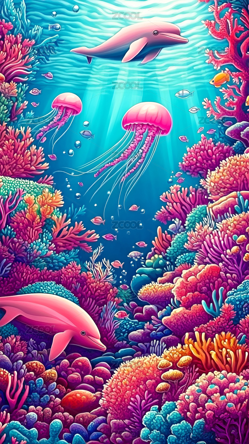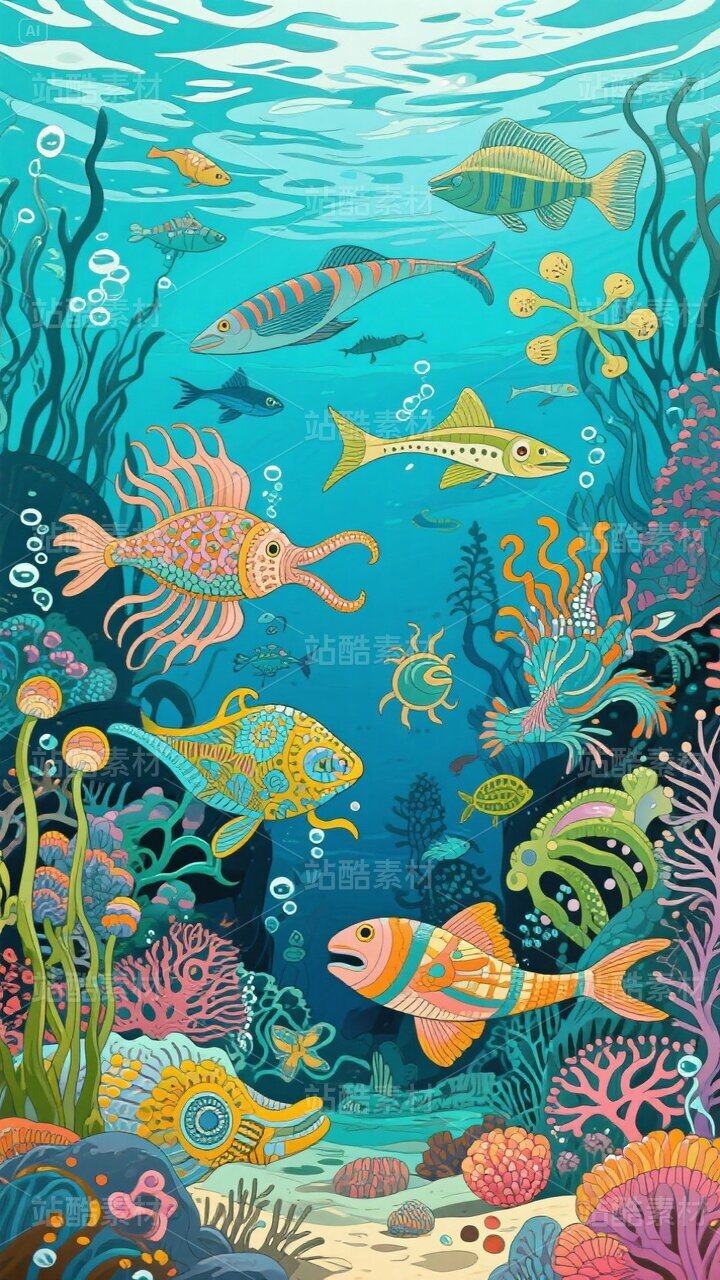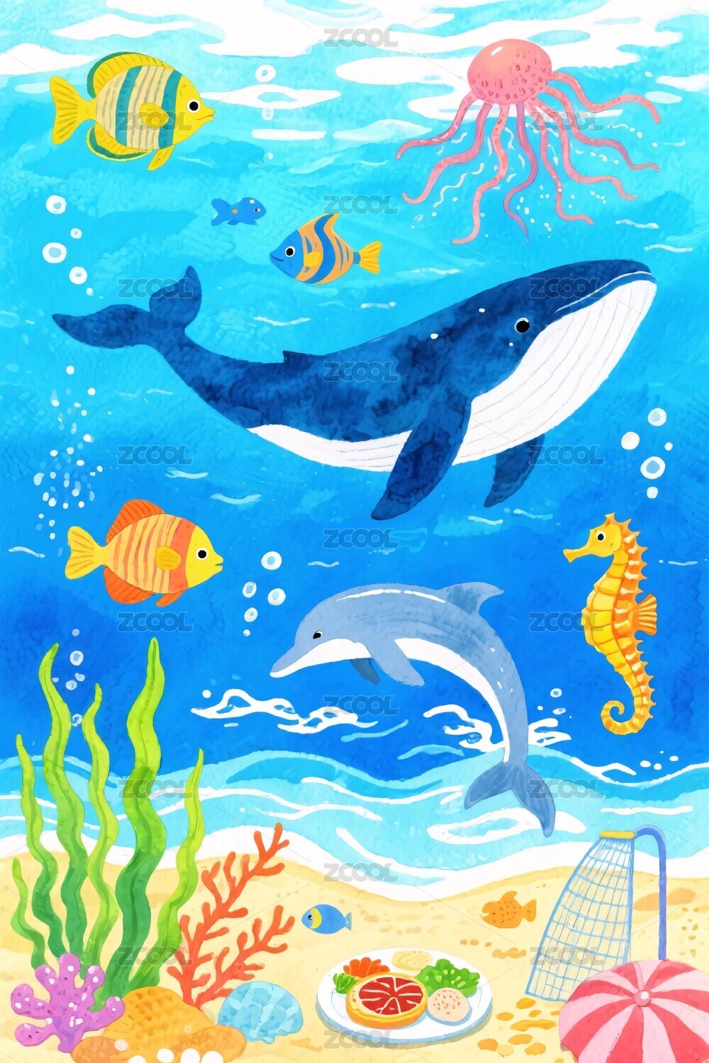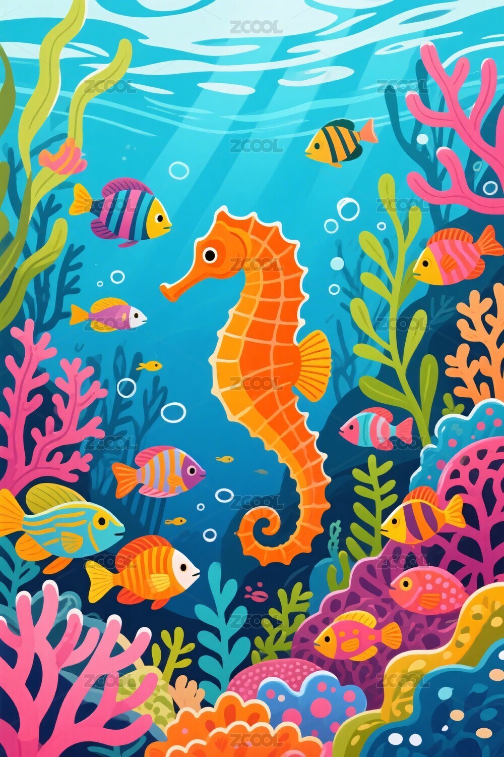 海洋,鲨鱼,水母,海马,珊瑚,海星,章鱼,彩色,插画,童趣