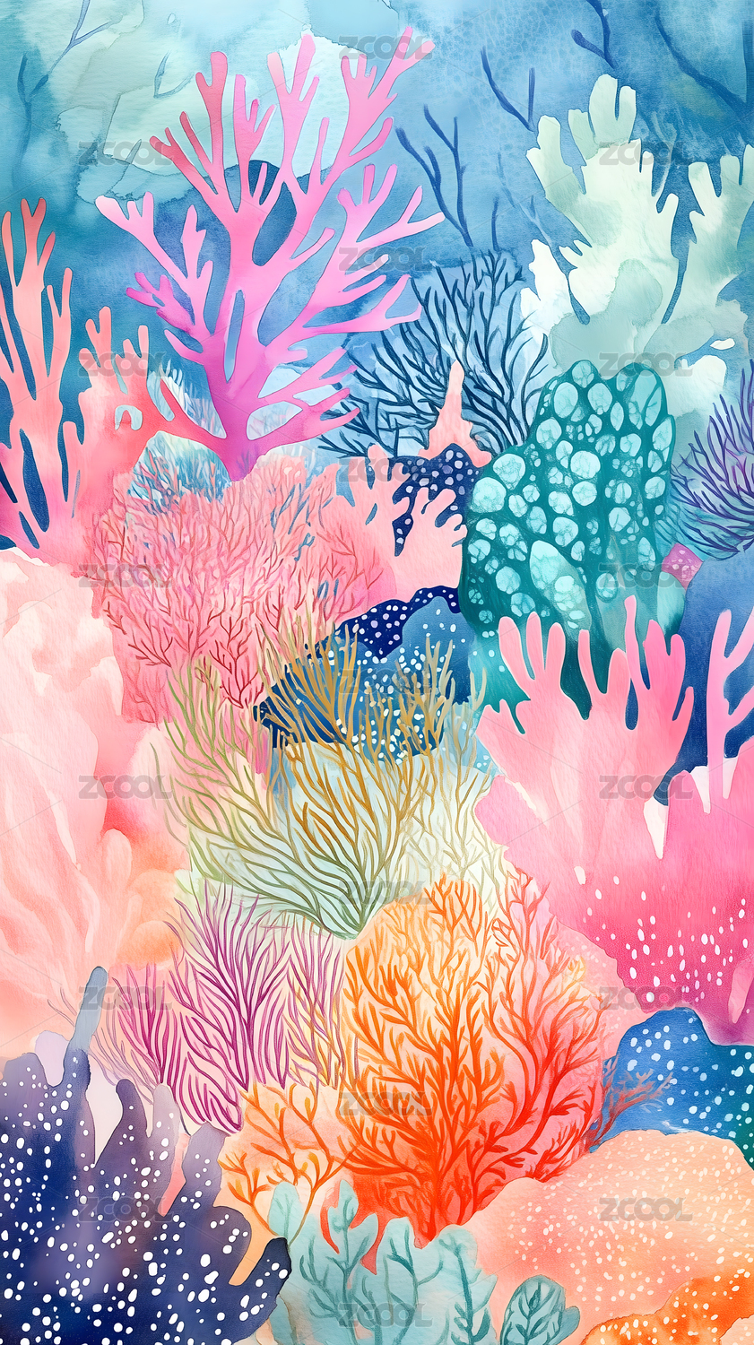 印刷复古清新明亮海底的彩色珊瑚插画绘画