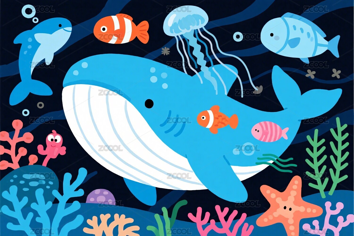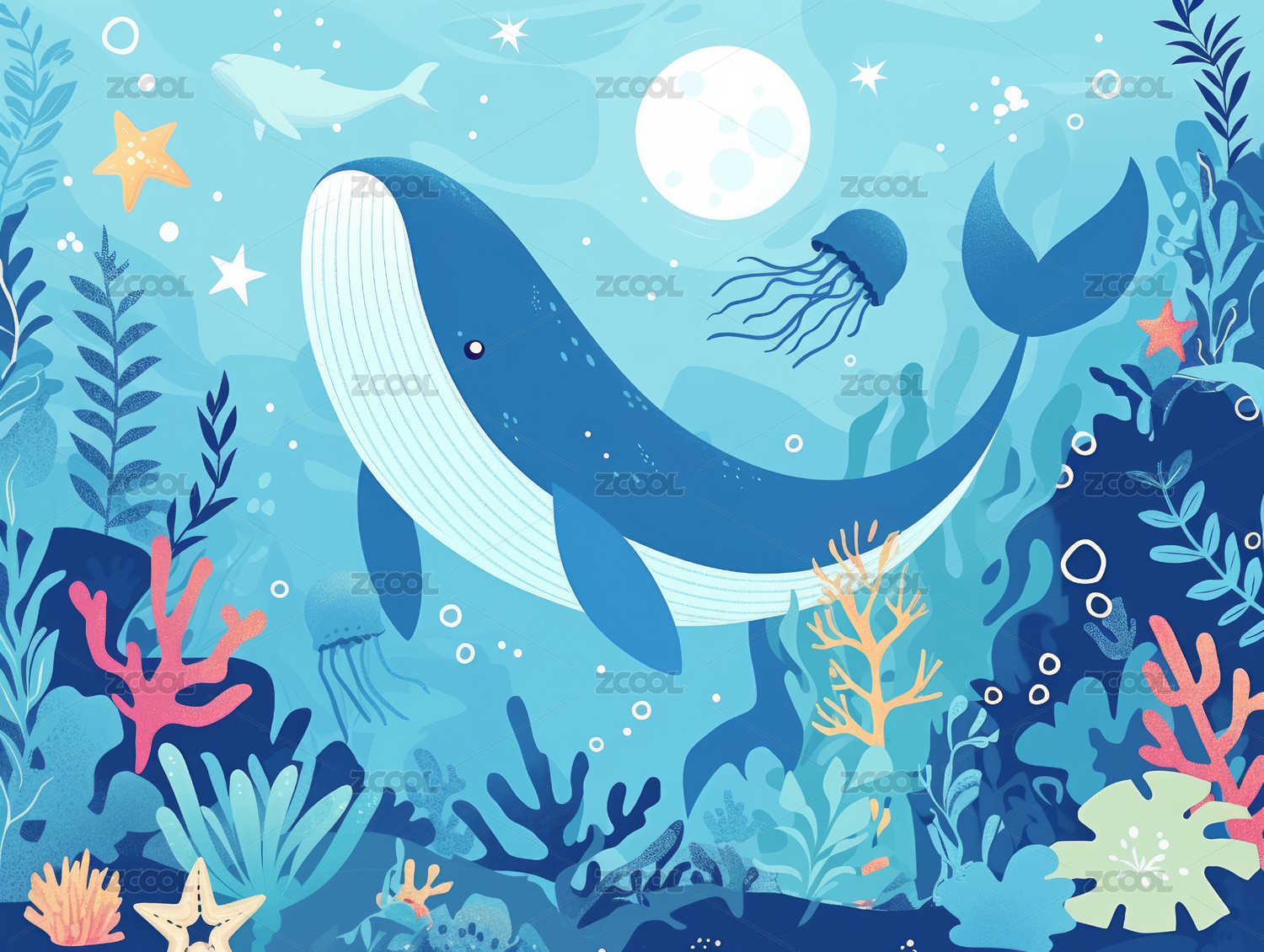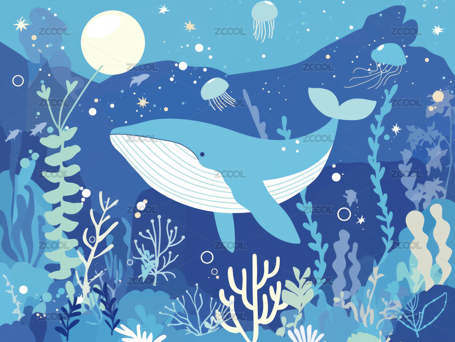 梦幻海洋鲸鱼清新插画