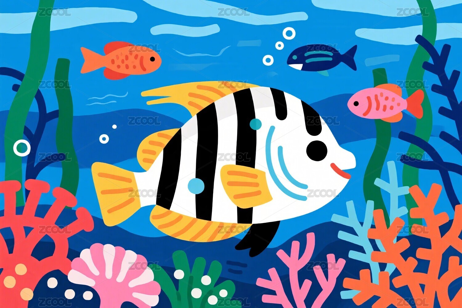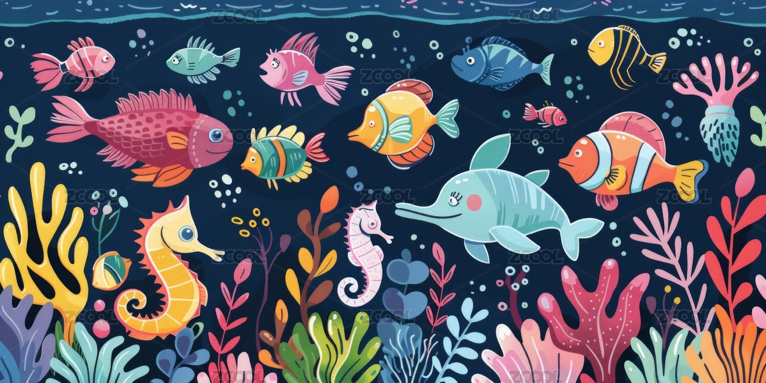 鱼群,珊瑚,水草,海洋,插画,卡通,彩色,艺术,生物,水底